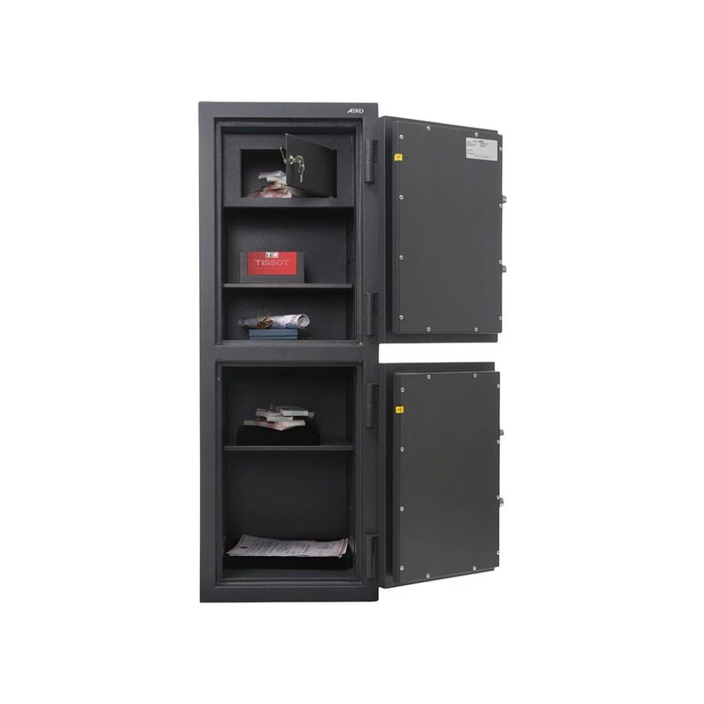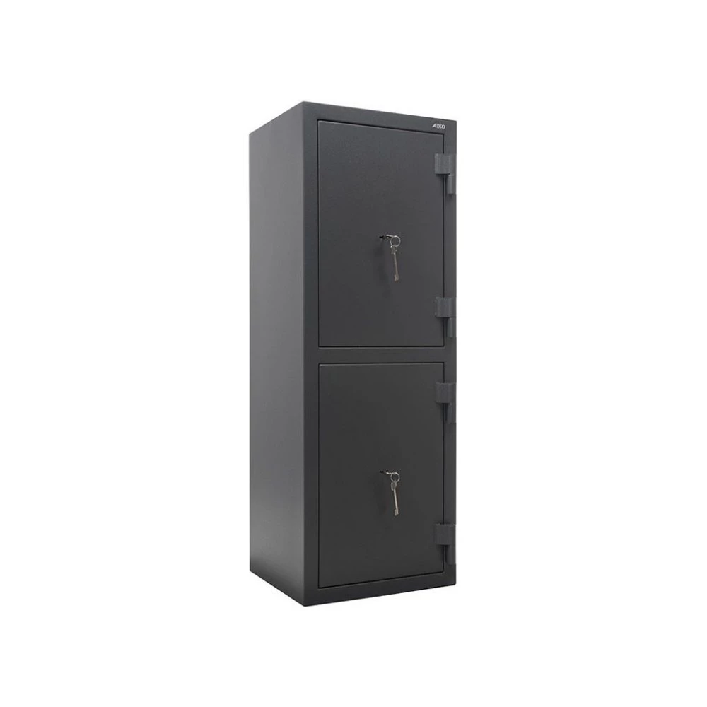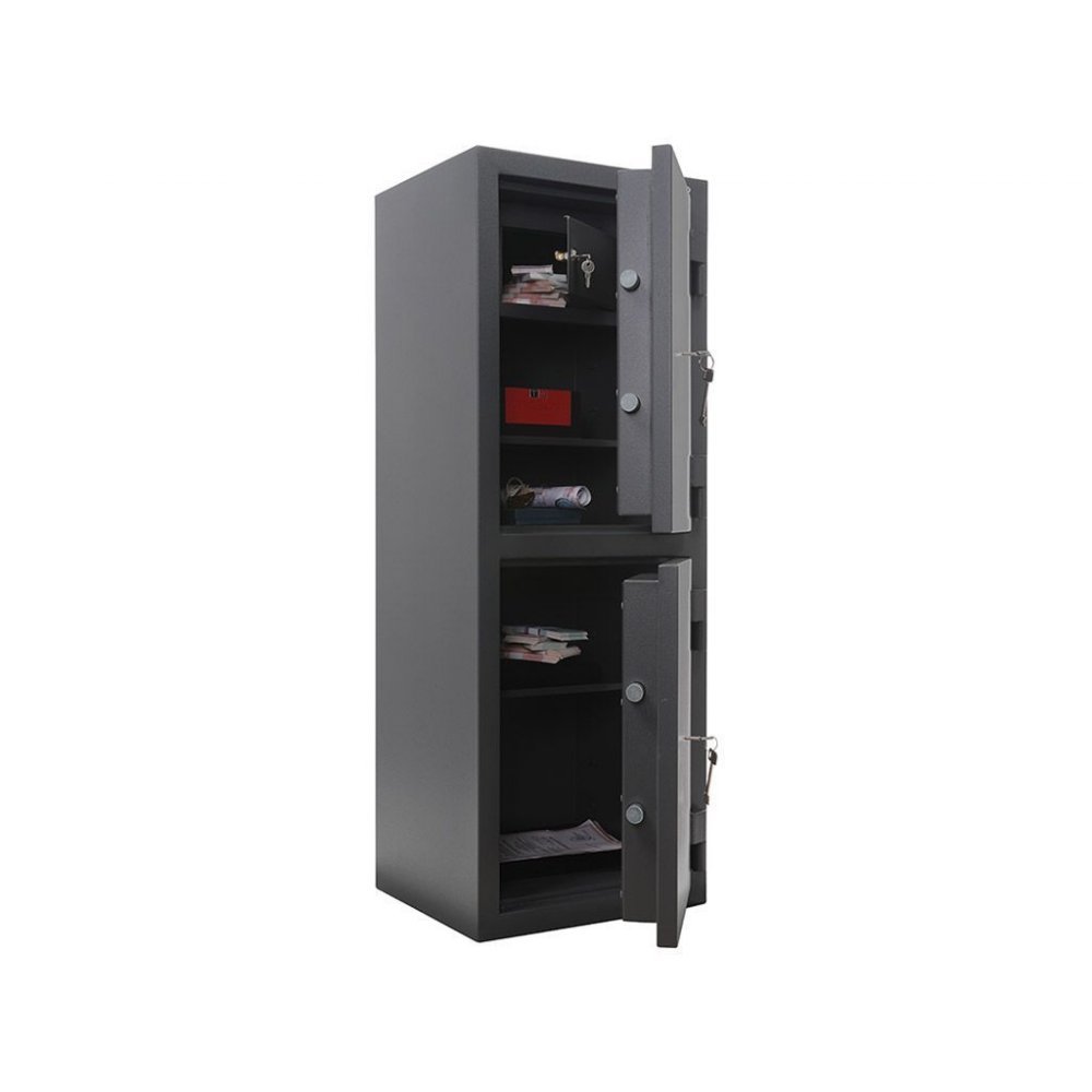 - Корпус разделен на два отделения с независимыми дверями. Надёжность корпуса и двери создаётся за счёт заливки бетоном.