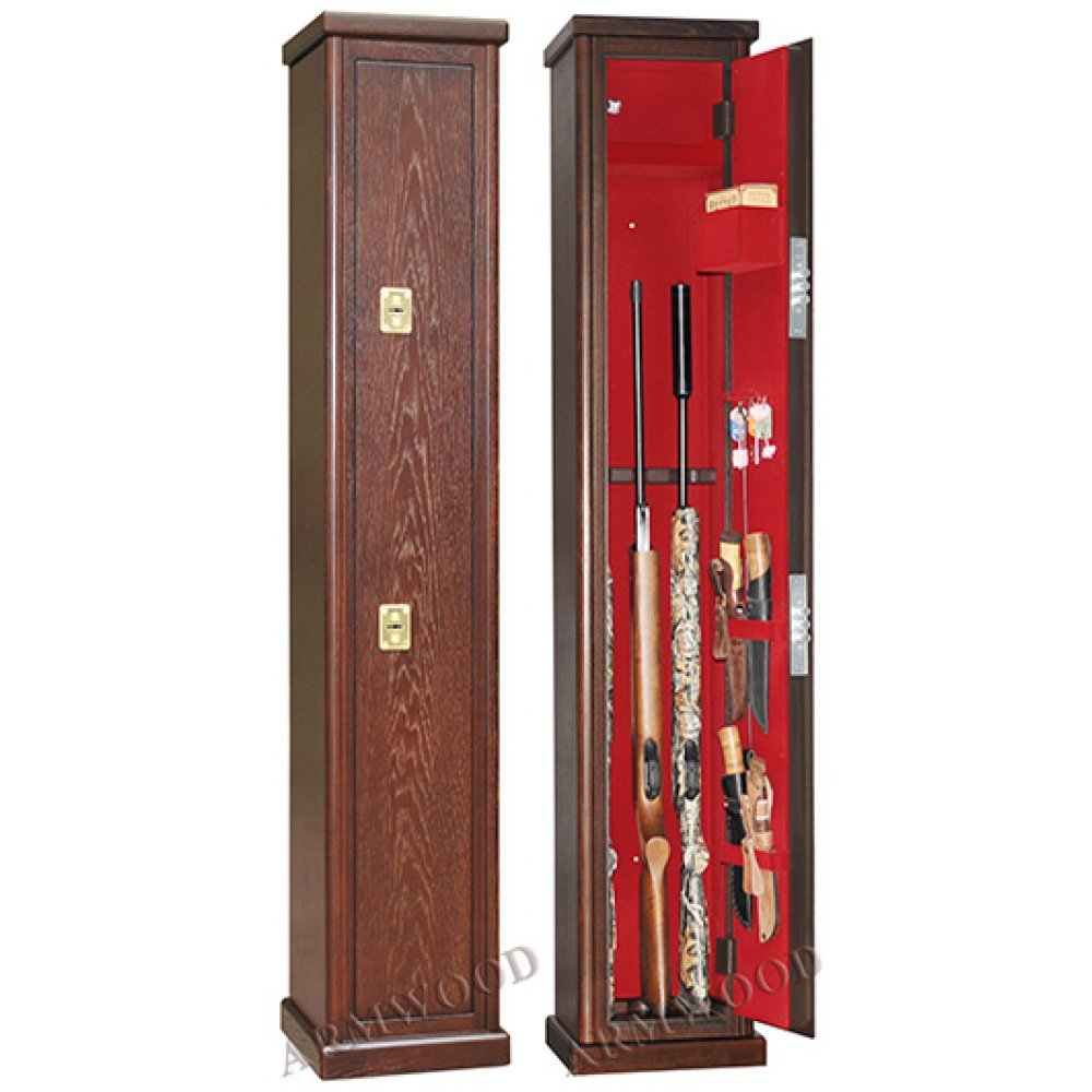Внутри сейфа есть запираемое (патронное) отделение и деревянные ложементы на 3 ствола.