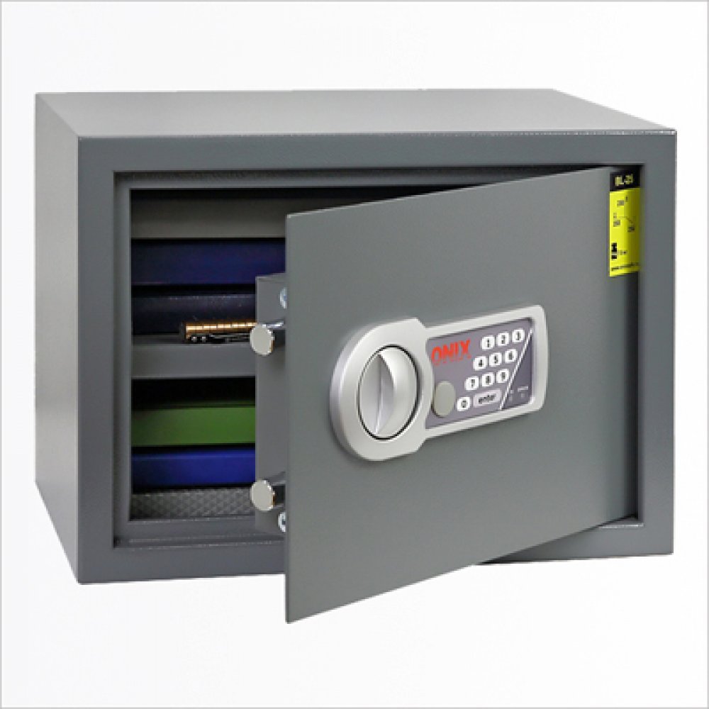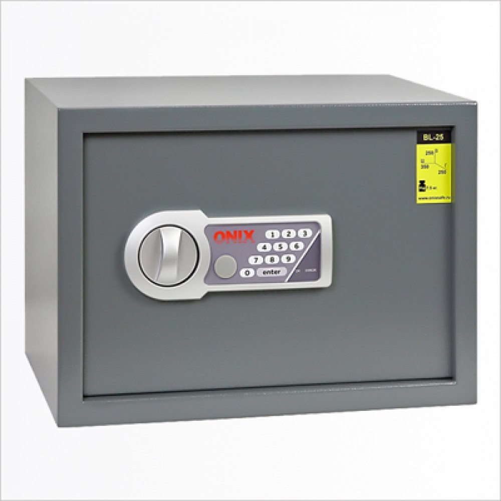 Дверь запирается электронным замком с возможностью настройки кодовой комбинации на замке от 3 до 8 цифр. Замок оснащен световым и звуковым оповещением, системой защиты от подбора кода и оборудован системой аварийного открывания, с помощью которой можно открывать сейф ключом входящим в комплект сейфа. Электронный замок мебельного сейфа Onix BL-25 работает от 4 батареек типа AA.