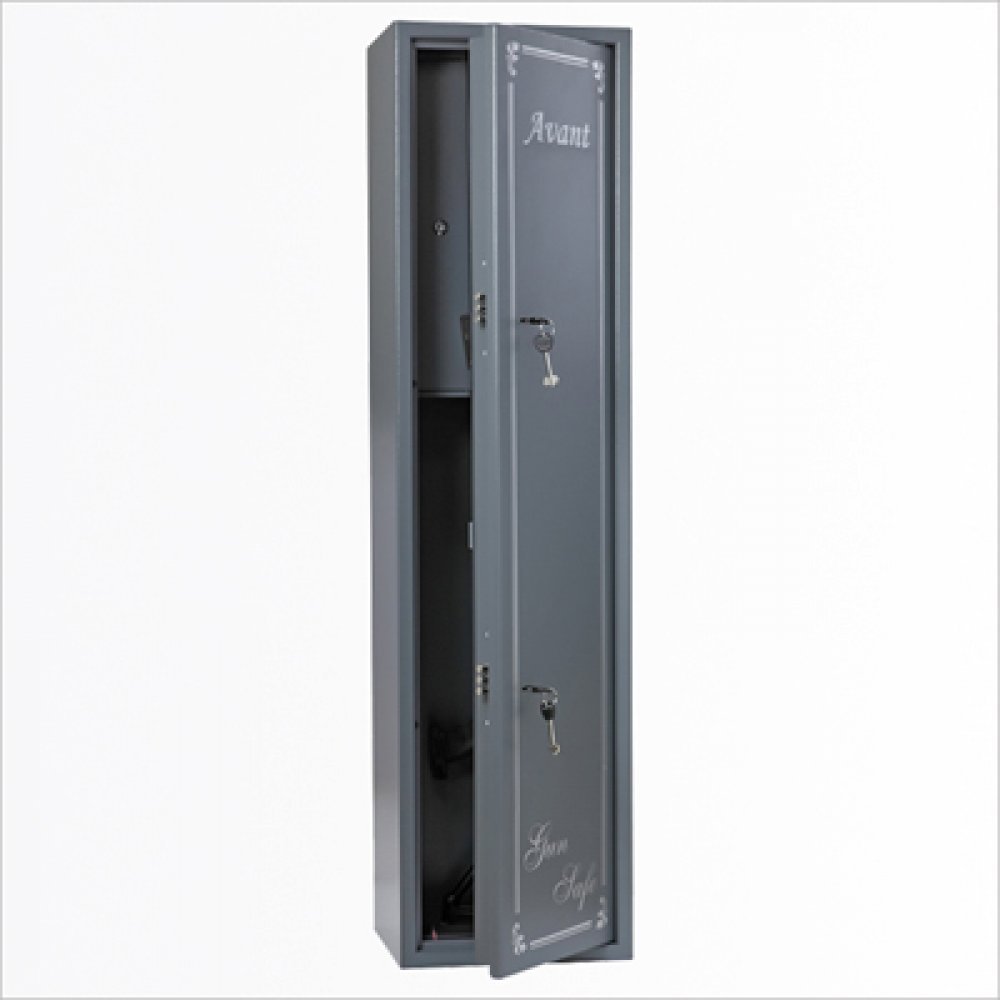 Дверь сейфа Авант 30Ms запирается двумя ключевыми замками и имеет защиту замков от высверливания, толщина стального листа двери составляет 3 мм. В верхней части корпуса есть съемный трейзер, который можно устанавливать как с левой так и с правой стороны, так же как и деревянный ложемент для ружей.