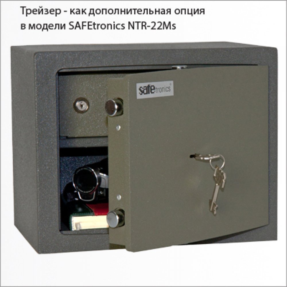 - Имеется возможность оснащения сейфа кассовой ячейкой (трейзером). В сейфах высотой от 650 миллиметров и более трейзер установлен по умолчанию. При необходимости его легко демонтировать и использовать дополнительную, регулируемую по высоте, полку