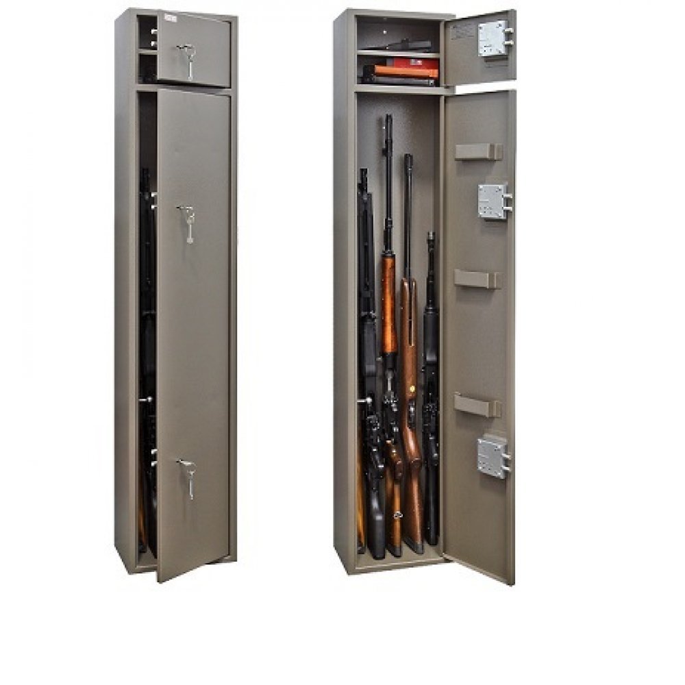 Верхнее отделение для хранения патронов, травматического оружия и т.д.. Оружейный шкаф изготовлен из качественной стали 1,5 мм. Покраска полимерная. На задней стенке оружейного шкафа два отверстия для крепления к стене. Оружейный Шкаф полностью соответствует требованиям МВД к хранению огнестрельного и травматического оружия.