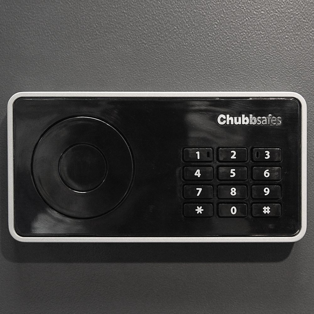 Дверь сейфа Chubb Fire 20E оснащена 3-х сторонней ригельной системой запирания, электронным кодовым замком Kaba Mauer (Германия), защитой замка и ригелей от высверливания и выбивания, а так же системой блокировки ригельного механизма при попытке выбить замок.