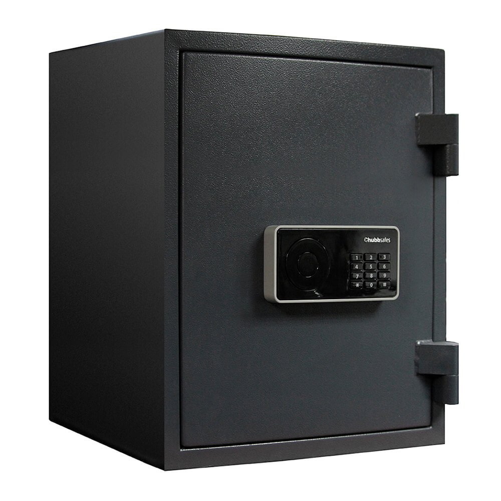Дверь сейфа Chubb Fire 25E оснащена 3-х сторонней ригельной системой запирания, электронным кодовым замком Kaba Mauer (Германия), защитой замка и ригелей от высверливания и выбивания, а так же системой блокировки ригельного механизма при попытке выбить замок.