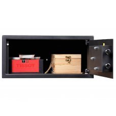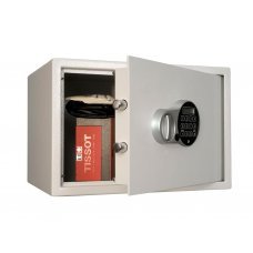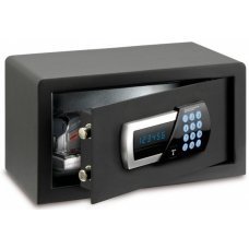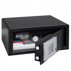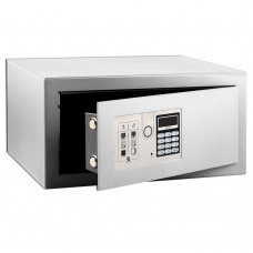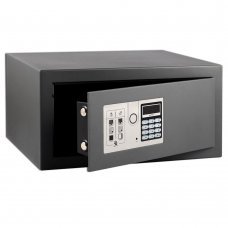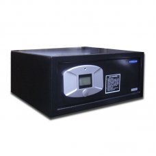 - С кодовым замком. Чаще всего в гостиничных номерах устанавливают небольшие модели именно с таким замком. Внутри они могут иметь полку для более оптимального использования пространства. Такие сейфы прекрасно подходят для хранения ценных вещей, документов, денег. Дверца открывается при помощи кода, который придумывает сам турист. Если же код забыт, шкаф можно открыть при помощи запасного мастер-ключа, который хранится у администратора гостиницы. Код после этого можно сбросить и назначить новый.
