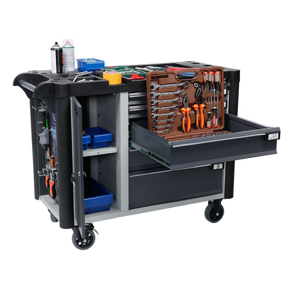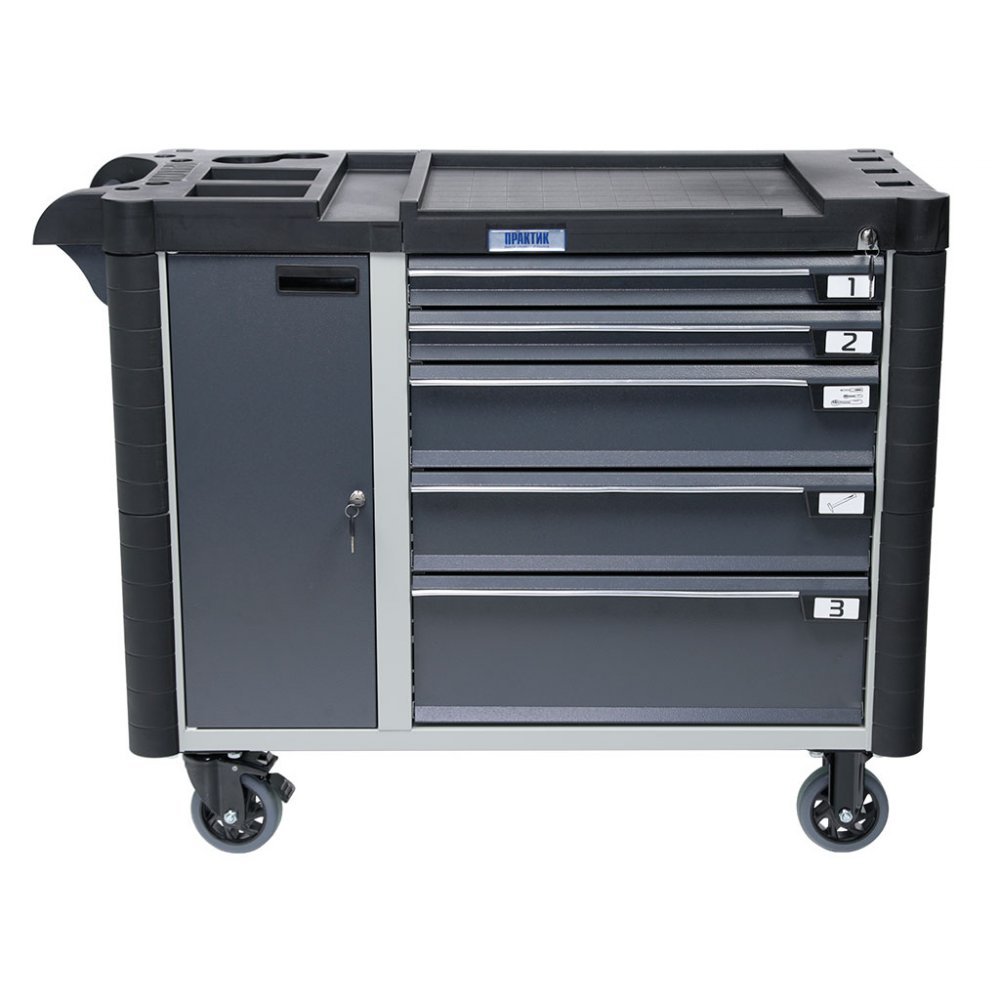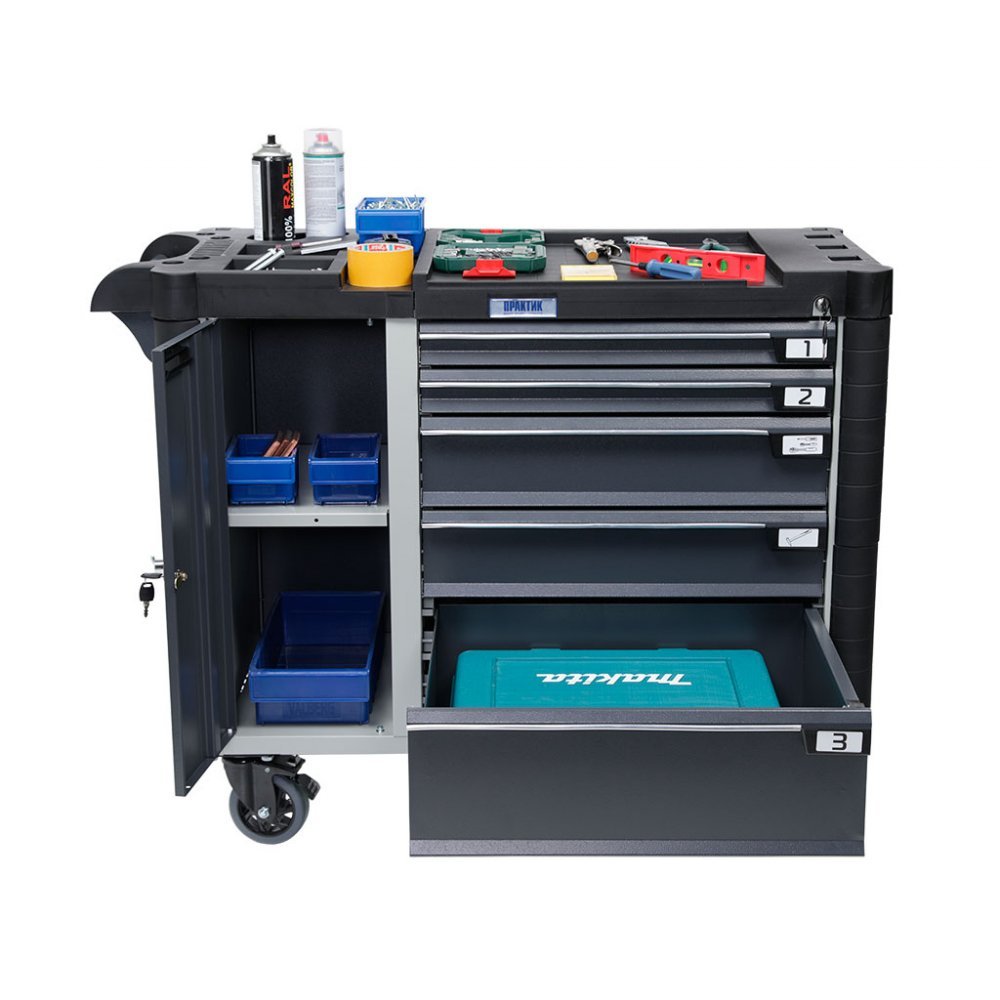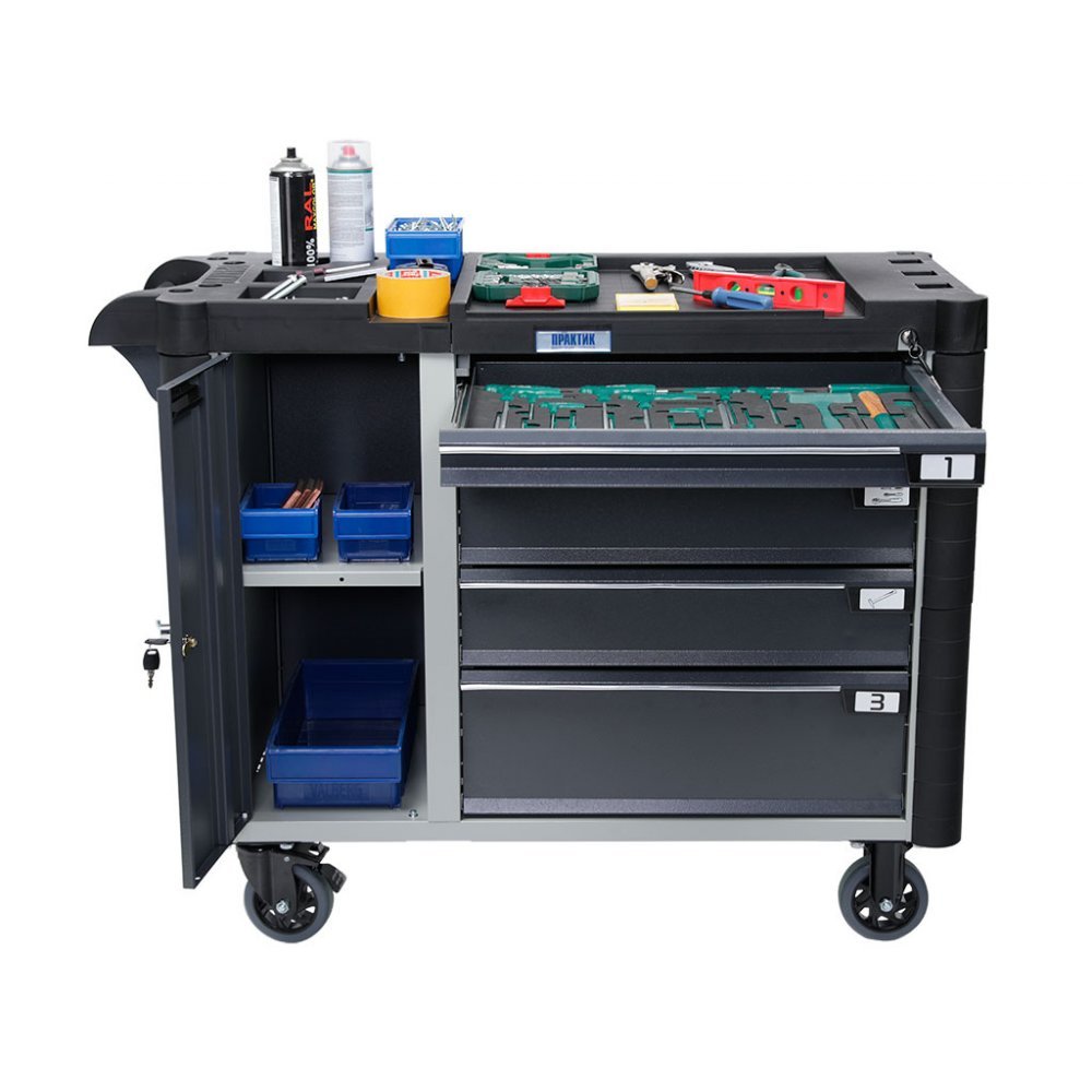 - Топ (пластик черного цвета) оснащён ложементами под инструменты для организации, хранения и удобства использования во время выполнения работ. Нагрузка на ТОП – 40 кг