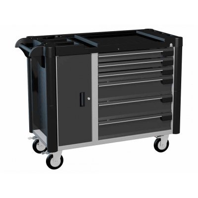 - Топ (пластик черного цвета) оснащён ложементами под инструменты для организации, хранения и удобства использования во время выполнения работ. Нагрузка на ТОП – 40 кг