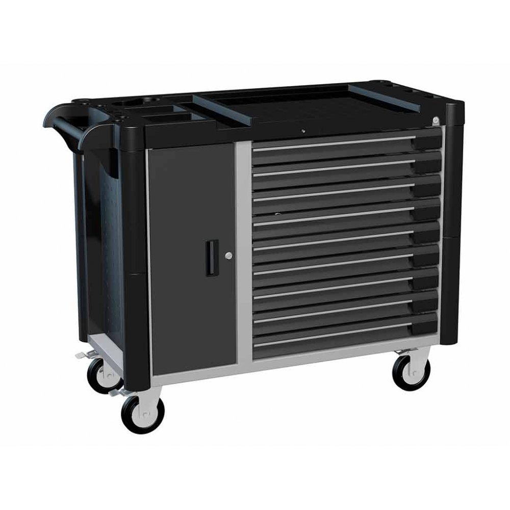 - Топ (пластик черного цвета) оснащён ложементами под инструменты для организации, хранения и удобства использования во время выполнения работ. Нагрузка на ТОП – 40 кг