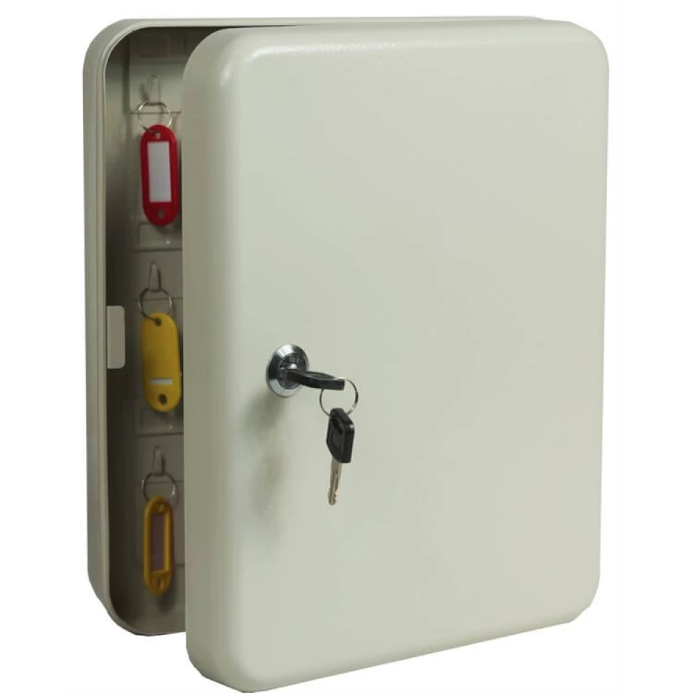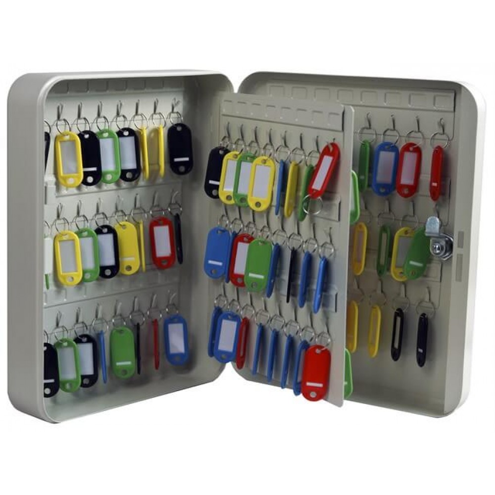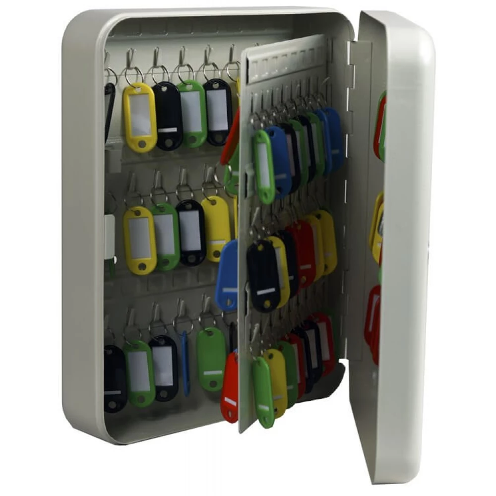 Металлическая ключница на 96 ключей с ключевым замком. Отличный дизайн. Надёжная конструкция. Цветные бирки-брелоки в комплекте в подарок!!!! Ключница имеет отверстия для крепления к стене. Крепление к стене в комплекте.