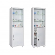 Шкафы для медицинских целей конструктивно могут включать закрытые и открытые отделения. Они выполняются с полками либо вертикальными секциями. В дверь может вставляться стекло для обзора содержимого. Некоторые модели включают 2 двери, расположенные друг над другом и открывающиеся в одну сторону.
