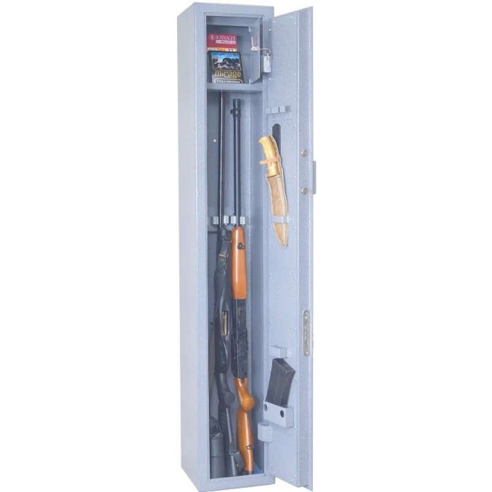 Сейф односекционный, на 3 ствола оснащен отделением под патроны. Ложементы — металлические держатели с резиновыми роликами. Максимальная высота устанавливаемого оружия — 1350 мм. Один замок ЗАО «Про-Сам» г. Рязань или аналогичный замки другого производителя. Второй замок кодовый электронный.