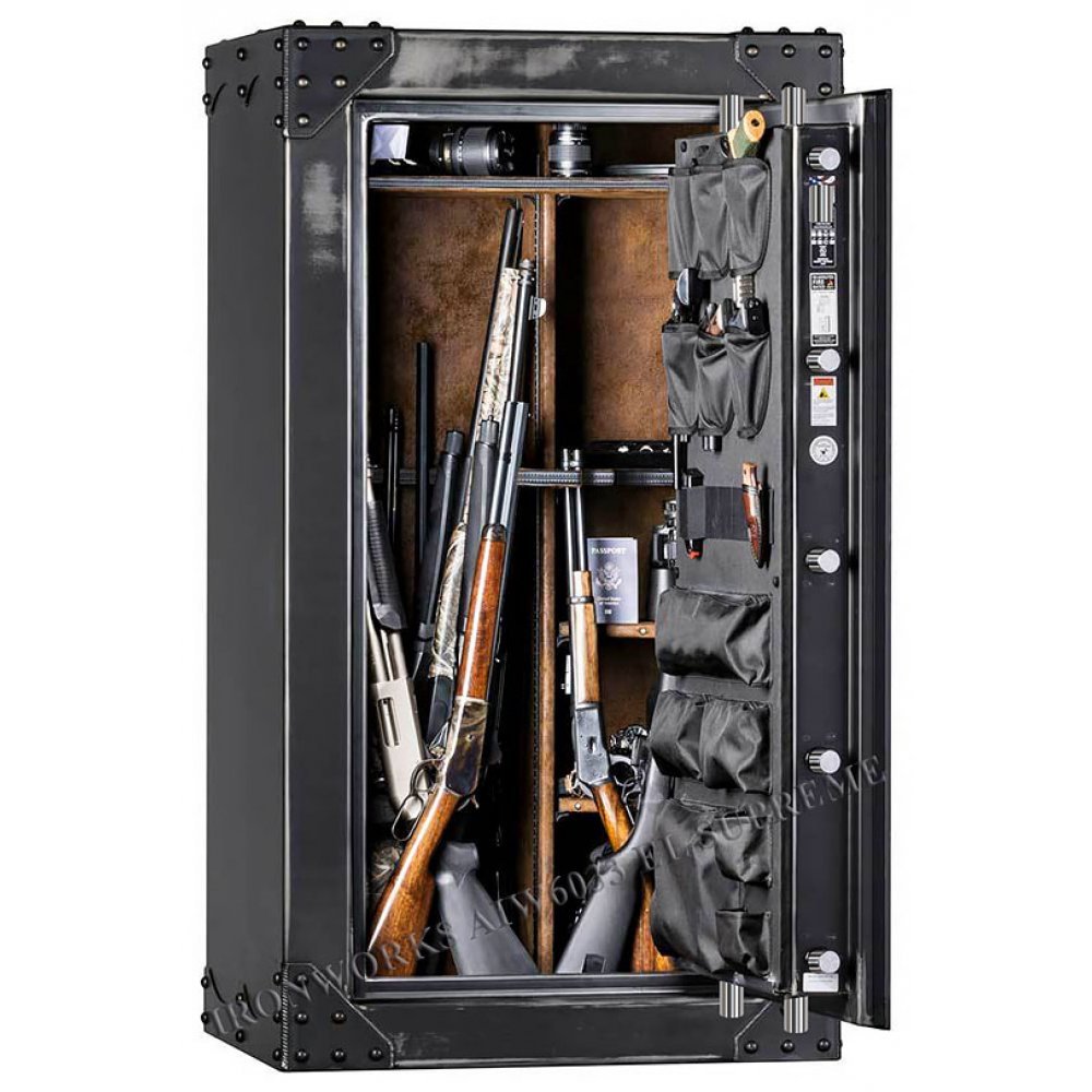 Корпус сейфа Rhino Ironworks AIW6033 EL Supreme - усиленный, цельносварной, изготовлен по специальной технологии сварки, и оборудован перегородкой, ложементами, полками, с возможностью регулировать высоту установки полки. Межстеночное расстояние в корпусе заполнено огнестойким наполнителем, предусмотрен контур уплотнения предотвращающий попадание внутрь сейфа горячего воздуха, при пожаре.
