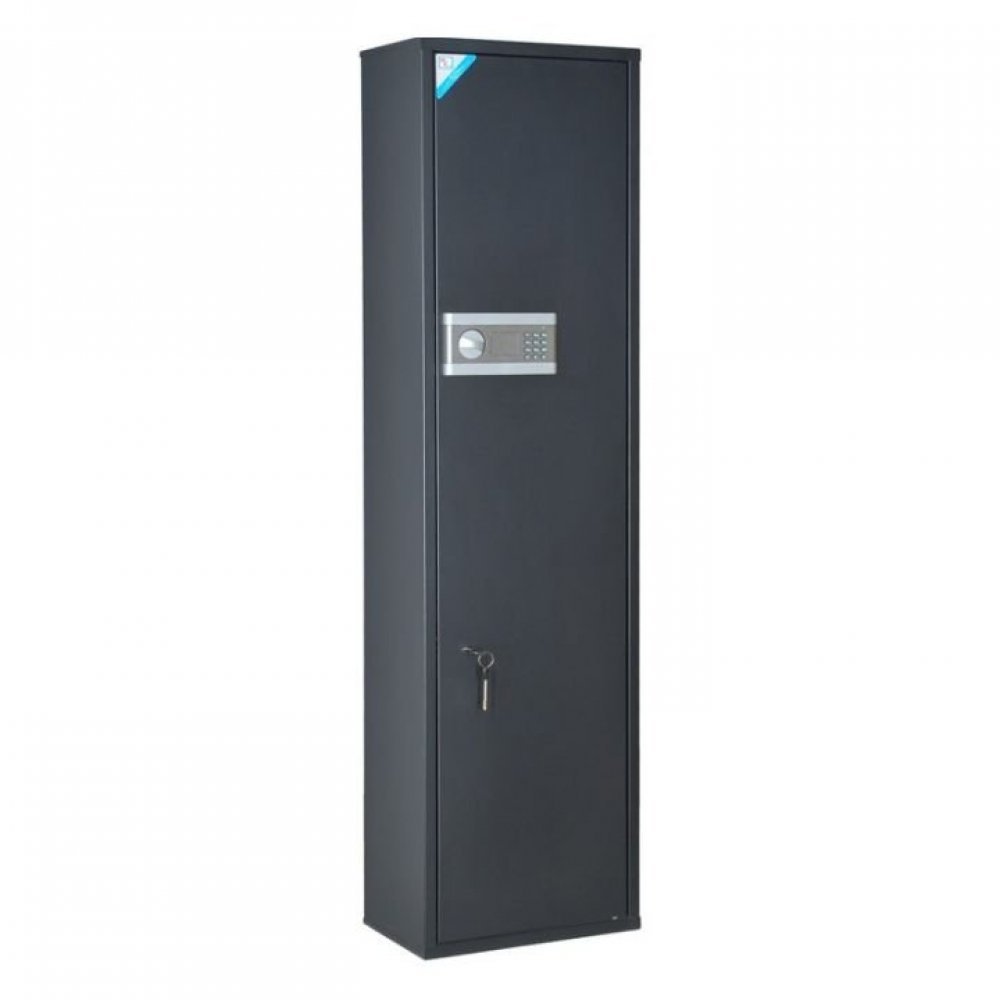 Вес конструкции - 26 кг. В шкафе возможно хранить три-четыре ствола длиной до 1335 мм. Имеется патронное отделение, закрывающееся ключом почтового типа и 3 съемные полочки. Сейф оснащен пластиковыми ложементами для оружия. Предусмотрена возможность крепить сейф к стене анкерным методом. Модель выполнена в черном цвете. Поверхность сейфа окрашена порошковой износостойкой эмалью на полимерной основе, защищающей корпус от царапин и ржавчины. На дне ковролиновый коврик.