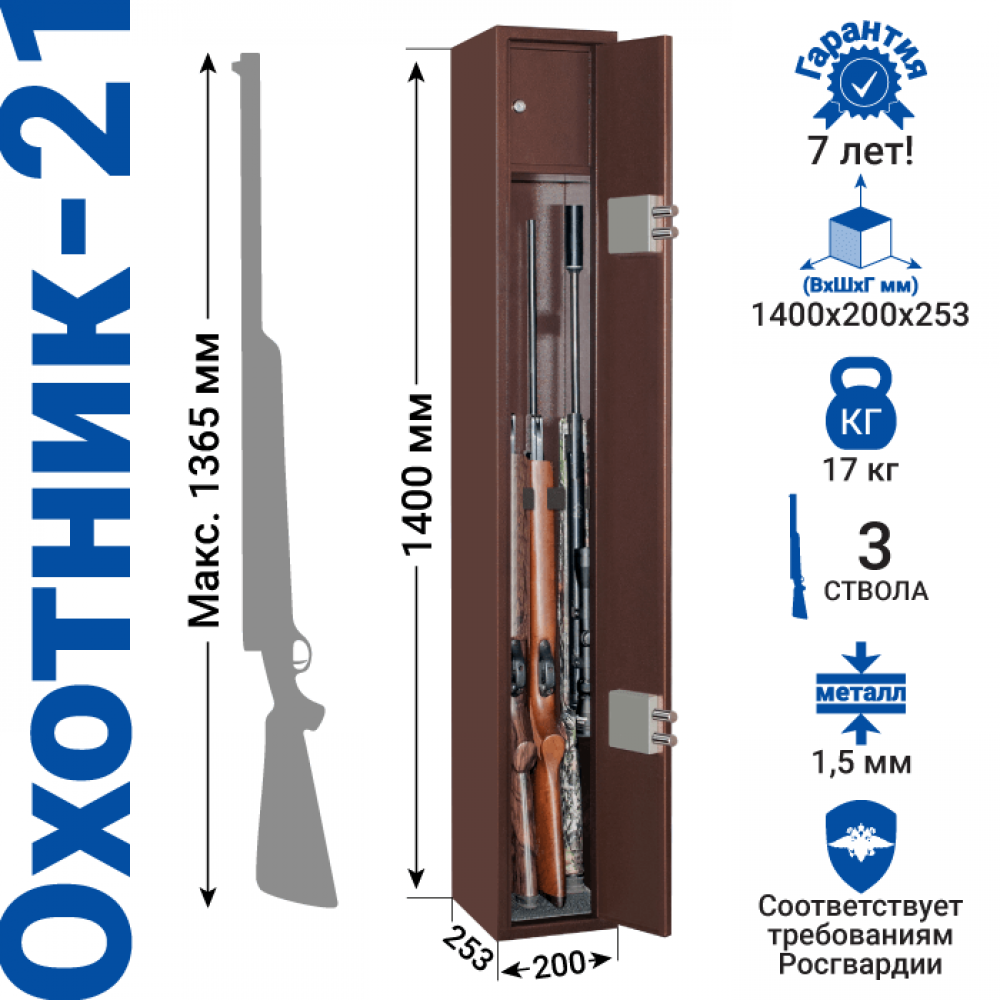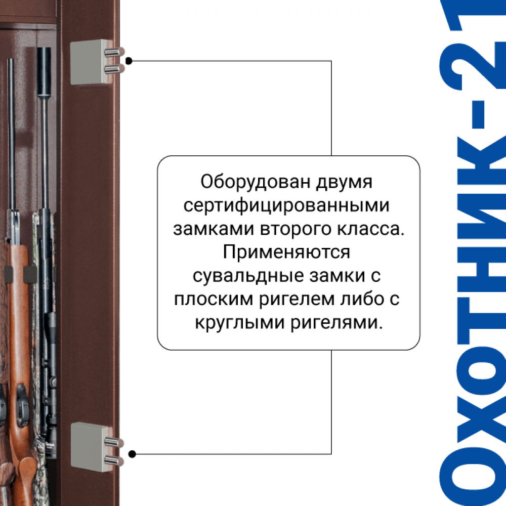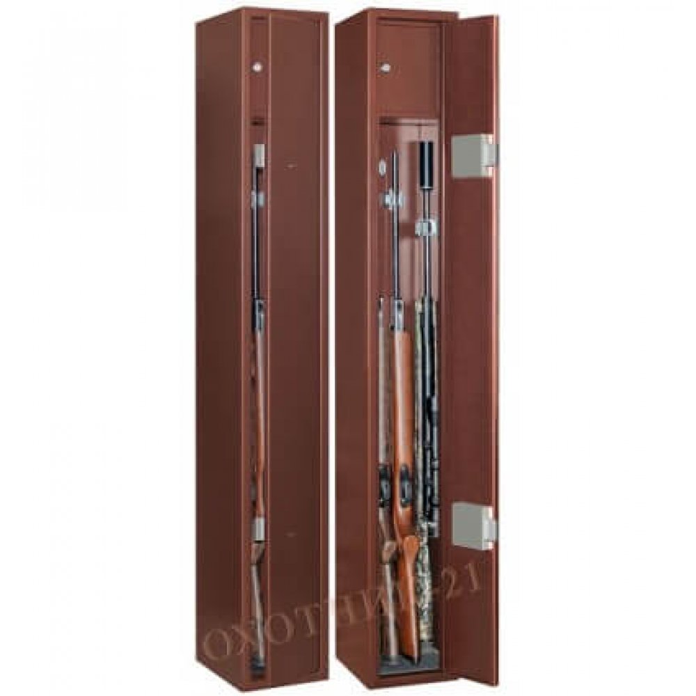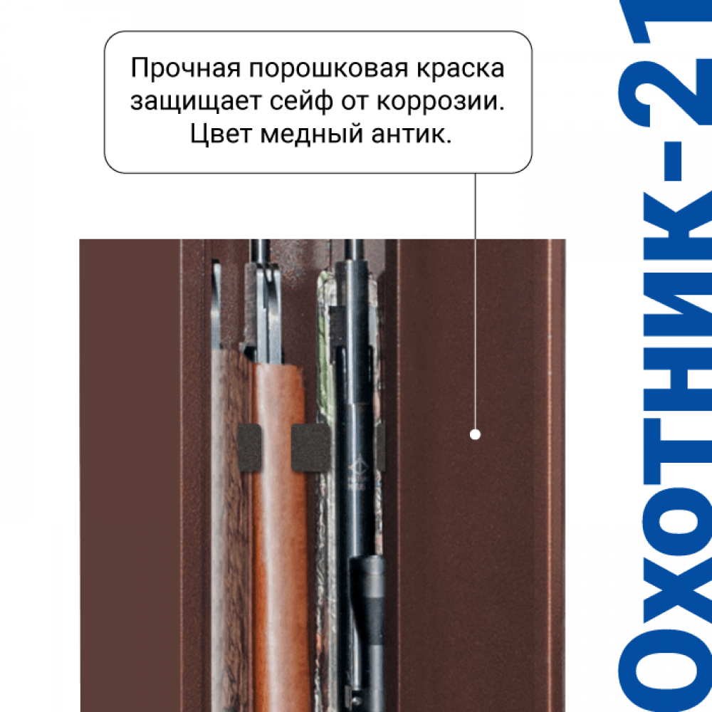 Сейф полностью удовлетворяет требованиям МВД и Росгвардии к хранению оружия физическими лицами. Оснащен двумя сейфовыми замками второго класса. Оборудован удобными ложементами для хранения оружия. Имеются отверстия на задней стенке сейфа для крепления к стене. Прочная порошковая краска защищает сейф от коррозии. Цвет медный антик.
