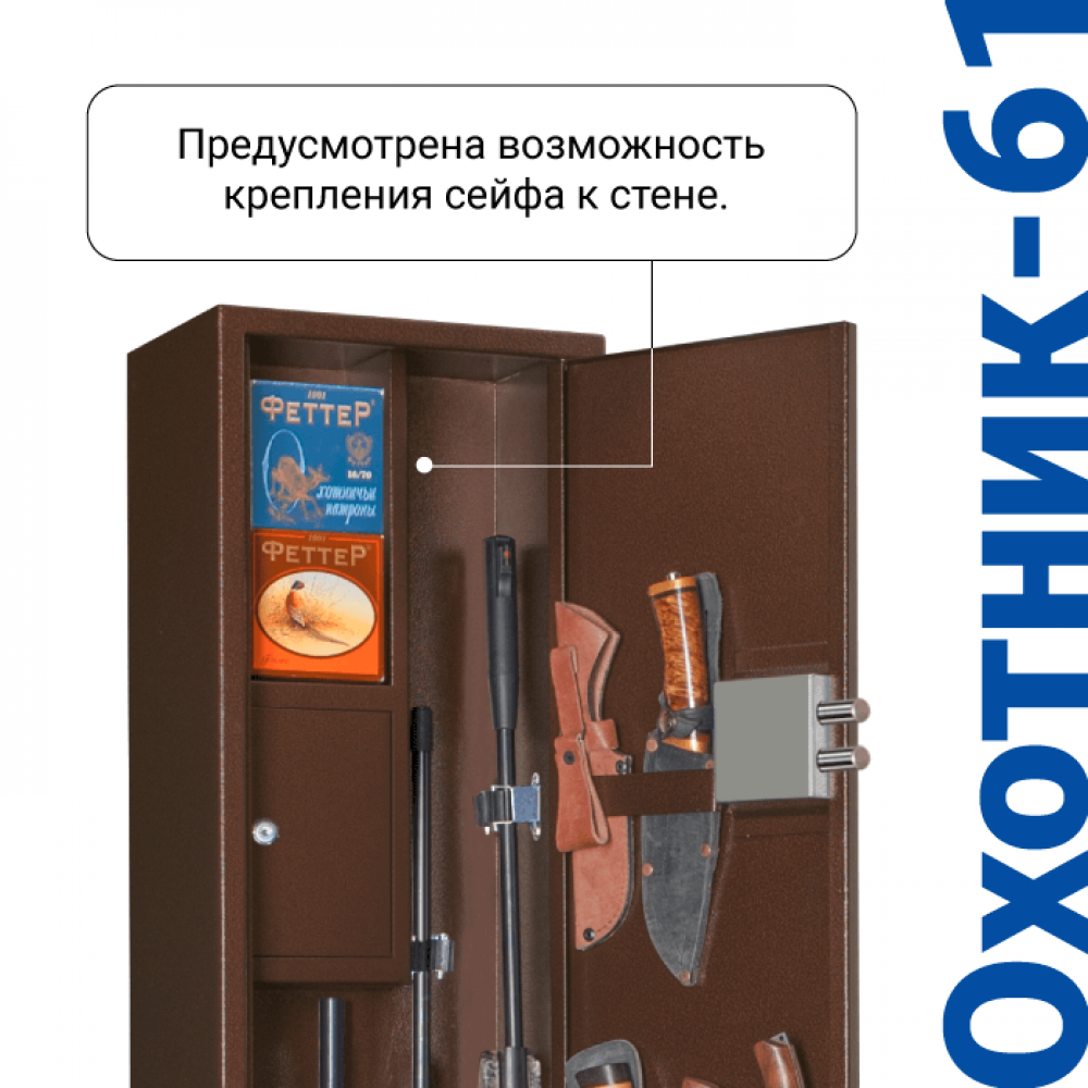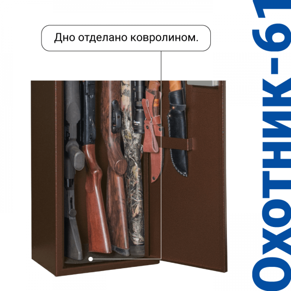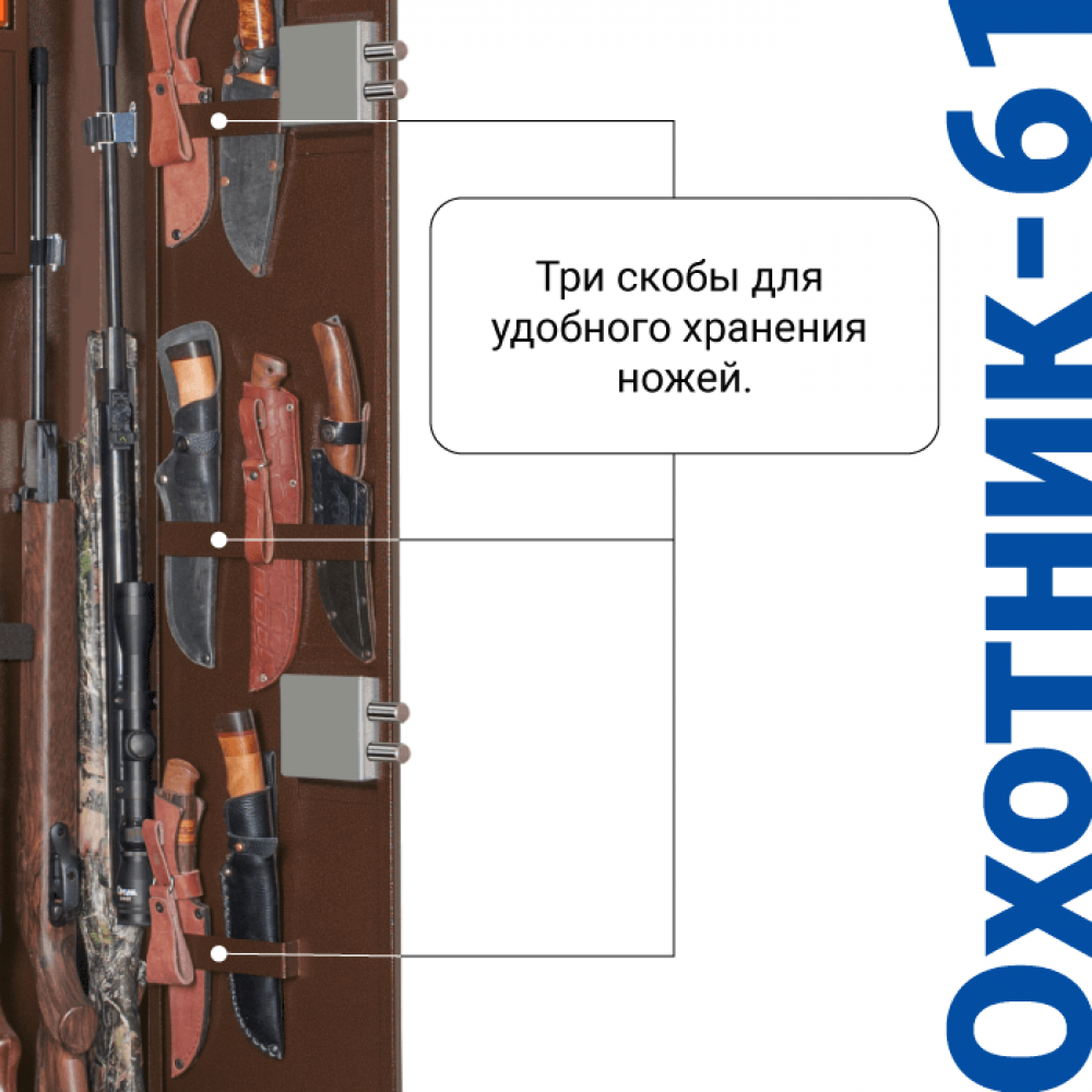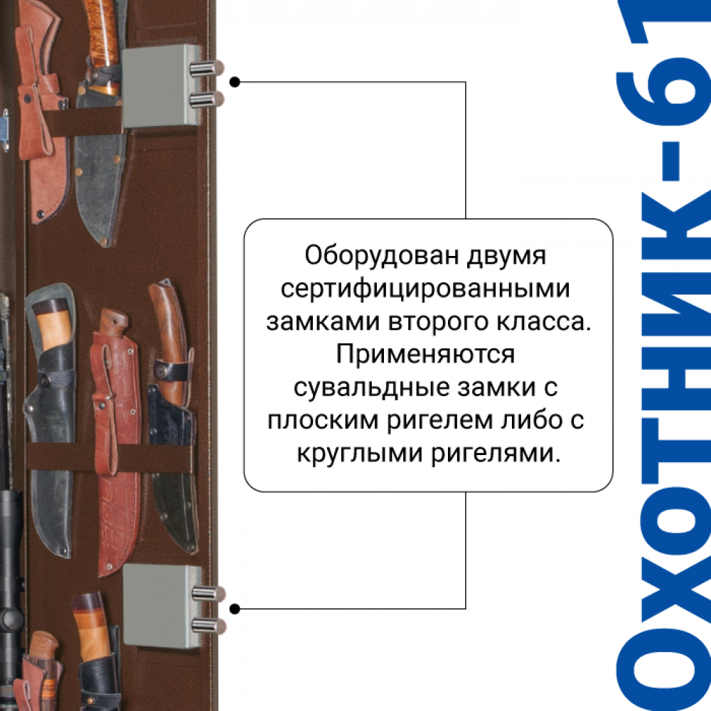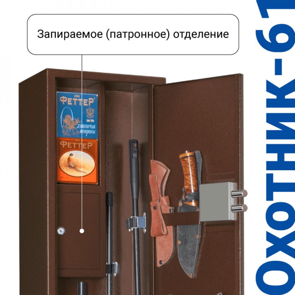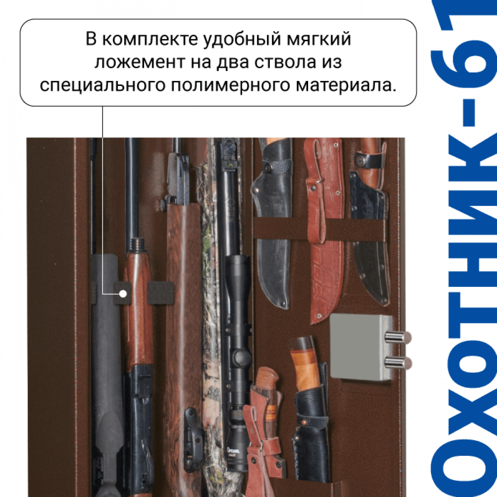 Изделие имеет внутреннее запираемое (патронное) отделение. Верхняя поверхность запираемого отделения используется в качестве полки. Дно изделия отделано ковролином. На внутренней стороне двери - три скобы для удобного хранения ножей. Удобный мягкий ложемент на два ствола из специального полимерного материала в комплекте. Ложемент легко устанавливается в любое нужное место шкафа.