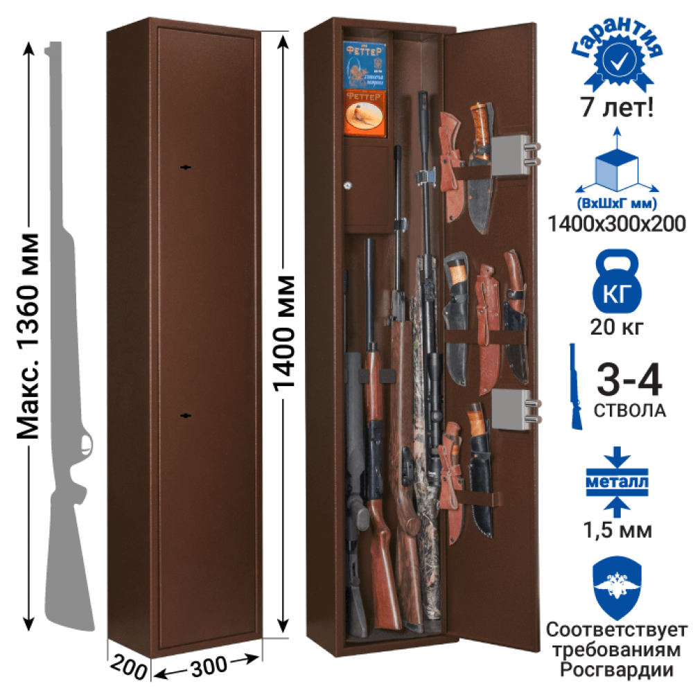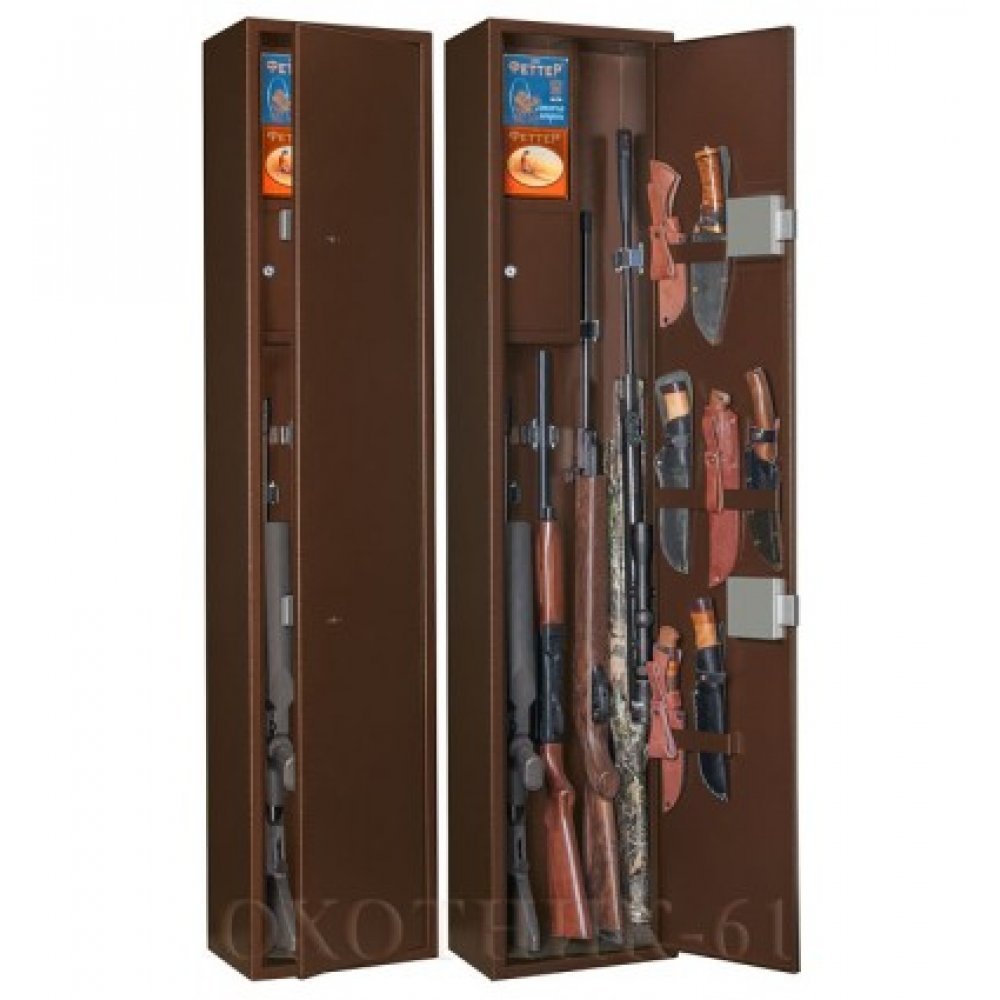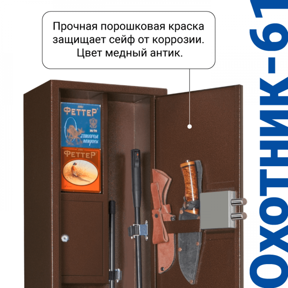 Сейф полностью удовлетворяет требованиям МВД и Росгвардии к хранению оружия физическими лицами. Оснащен двумя сейфовыми замками второго класса. Оборудован удобными ложементами для хранения оружия. Имеются отверстия на задней стенке сейфа для крепления к стене. Прочная порошковая краска защищает сейф от коррозии. Цвет медный антик.