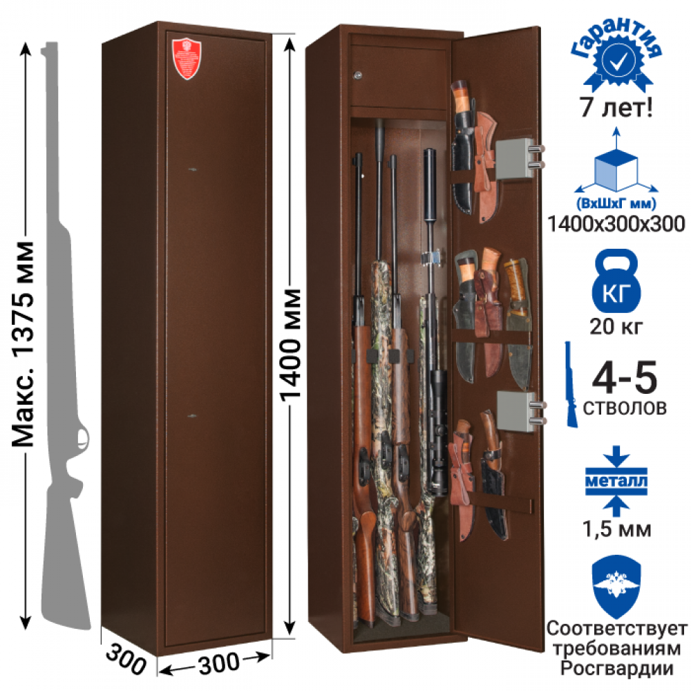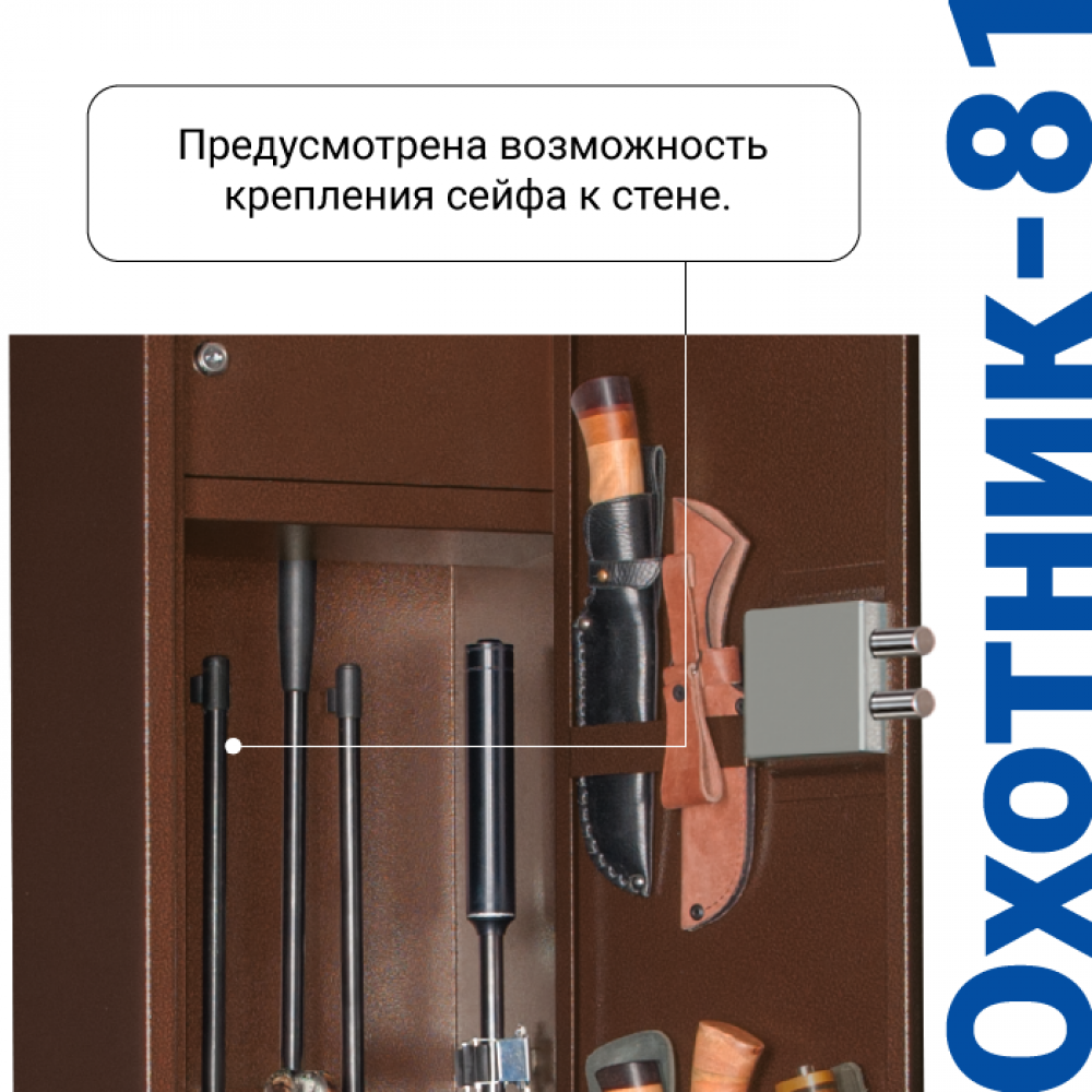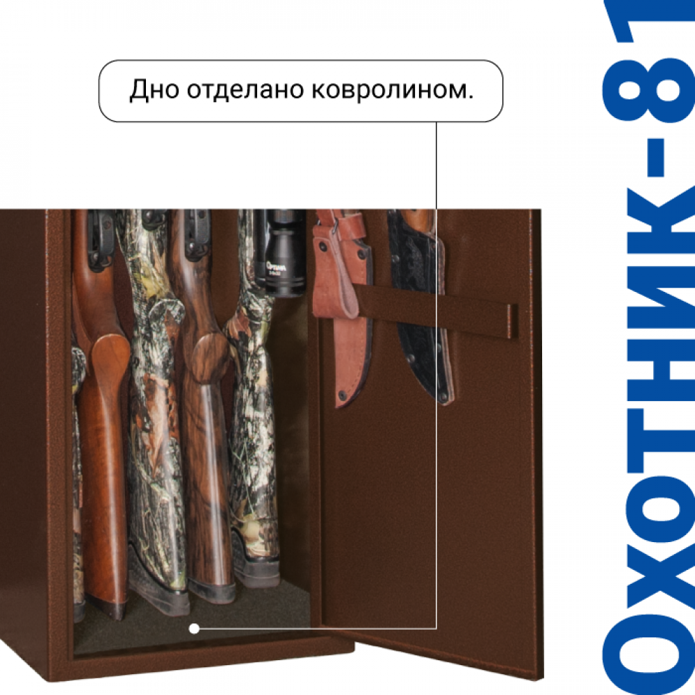 Оружейный шкаф имеет внутреннее запираемое (патронное) отделение специальной конструкции, которая позволяет хранить ружья, высота которых практически равна высоте металлического шкафа. На внутренней стороне двери - три скобы для удобного хранения ножей. Дно этого оружейного шкафа отделано ковролином. Удобный мягкий ложемент на четыре ствола (возможна замена на иные варианты) из специального полимерного материала в комплекте. Ложемент легко устанавливается в любое нужное место шкафа.