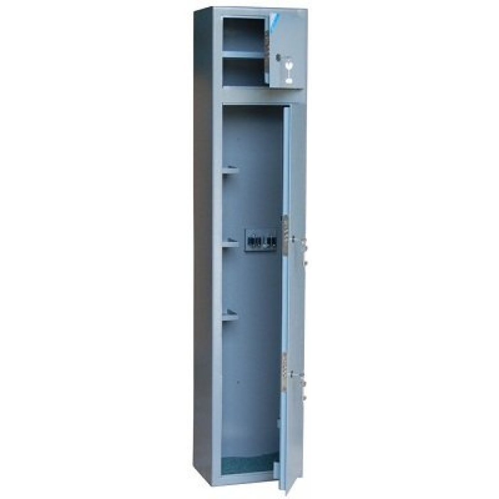 Сейф двухсекционный, на 2 ствола оснащен съемными полками и отдельной секцией под патроны. Ложементы — металлические держатели с резиновыми роликами. Три замка ЗАО "Про-Сам" г. Рязань или аналогичные замки другого производителя.