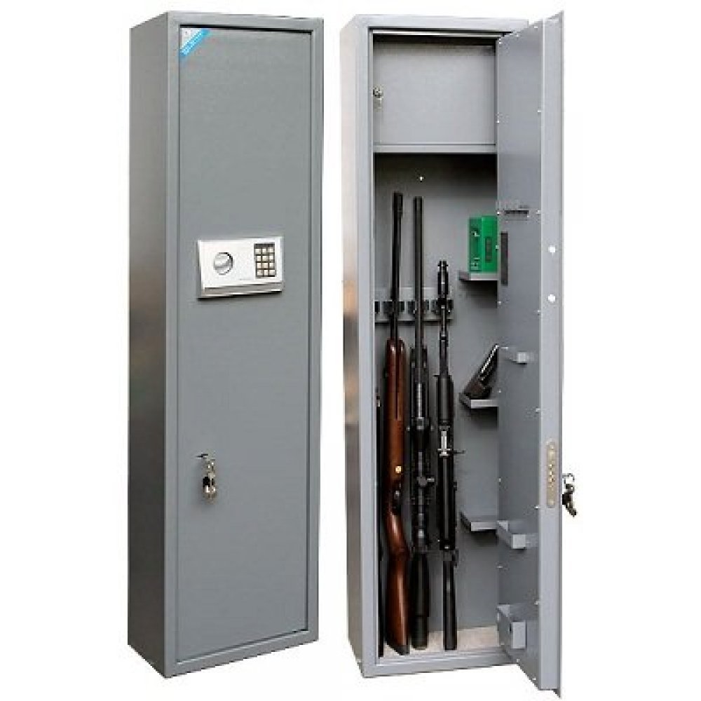Шкаф односекционный, на 4 ствола оснащен съемными полками и отделением под патроны. Ложементы — металлические держатели с резиновыми роликами. В двери установлен замок электронный сейфовый мод. ЕА который соответствует ГОСТ Р 51053-97, п.п. 5.1-5.4, 5.7 и классу А. второй замок ЗАО "Про-Сам" г. Рязань или аналогичный замок другого производителя.