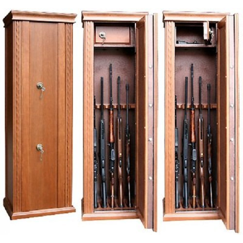 Оружейный сейф на 5 стволов. Корпус 3 мм + дверь 5 мм. Два немецких ключевых замка MAUER. Ригельная система имеет 5 ригелей диаметром 24 мм,запирающих сейф по периметру. Возможна установка под заказ немецкого электронного замка MAUER Code-Combi K или механического кодового замка Sargeant (USA) со сменным шифром. Отделение под патроны. Отделка натуральным шпоном дуба. Возможность тонировки по образцу мебели. 12 вариантов цветов.Внутри сейф оборудован деревянными дубовыми ложементами под цевье и под приклад.Покраска металлического корпуса сейфа-порошковая. Цвет медный антик или коричневый.Сейф полностью удовлетворяет требованиям МВД к хранению оружия и правил оборота гражданского и служебного оружия и патронов к нему.