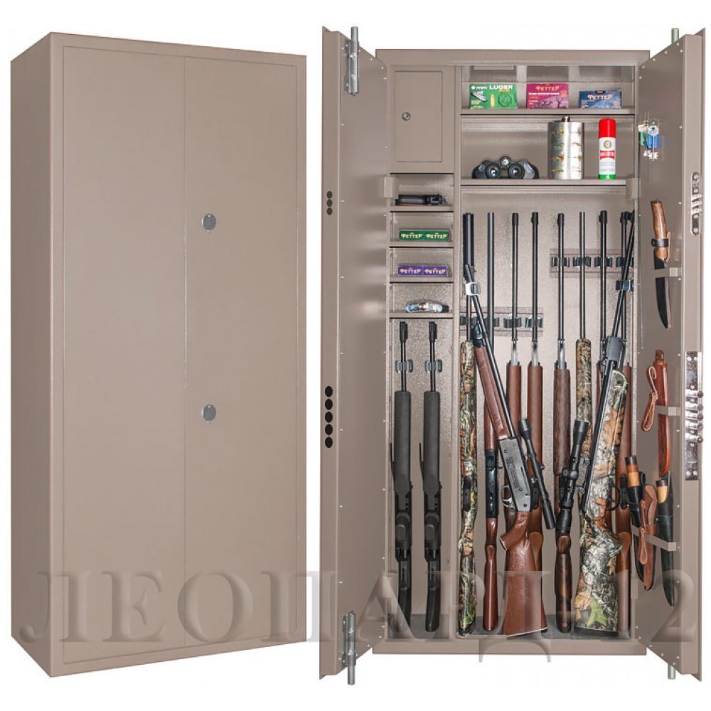 Сейф полностью удовлетворяет требованиям МВД и Росгвардии к хранению оружия физическими и юридическими лицами. Толщина металла не менее 3 мм. Оснащен двумя сейфовыми замками второго класса. Оборудован удобными ложементами для хранения оружия. Имеются анкерные отверстия на задней стенке сейфа для крепления к стене.