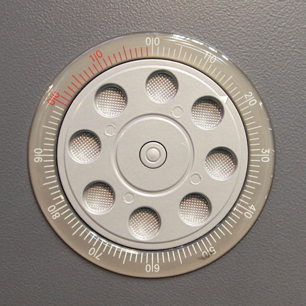 - На дверь установлен кодовый механический замок Sercas (Италия), класс В по европейскому стандарту EN 1300. На замке имеется три наборных круга, таким образом код состоит из трёх чисел (возможно 1 440 000 комбинаций). Вы можете изменить код при помощи ключа или сбросить его на «нулевой», если дверь открыта.