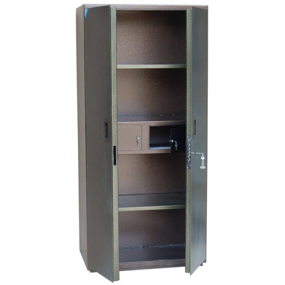 Сейф односекционный, двухдверный, оснащен двумя съемными полками и двумя Трейзерами. В двери установлен ключевой 8-ми сувальдный замок ЗАО «Про-Сам» г. Рязань или аналогичный замок другого производителя.