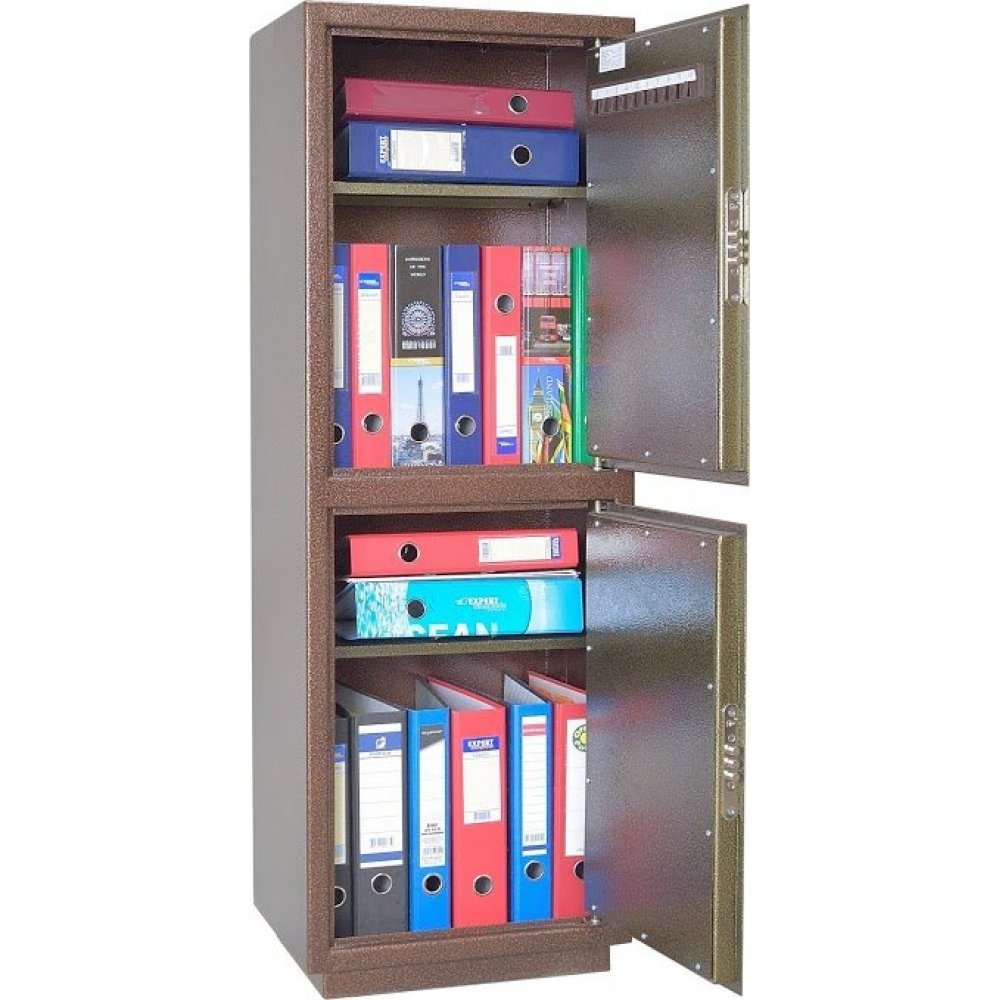 Сейф двухсекционный, оснащен двумя съемными полками. В двери установлен ключевой 8-ми сувальдный замок ЗАО «Про-Сам» г. Рязань или аналогичный замок другого производителя.