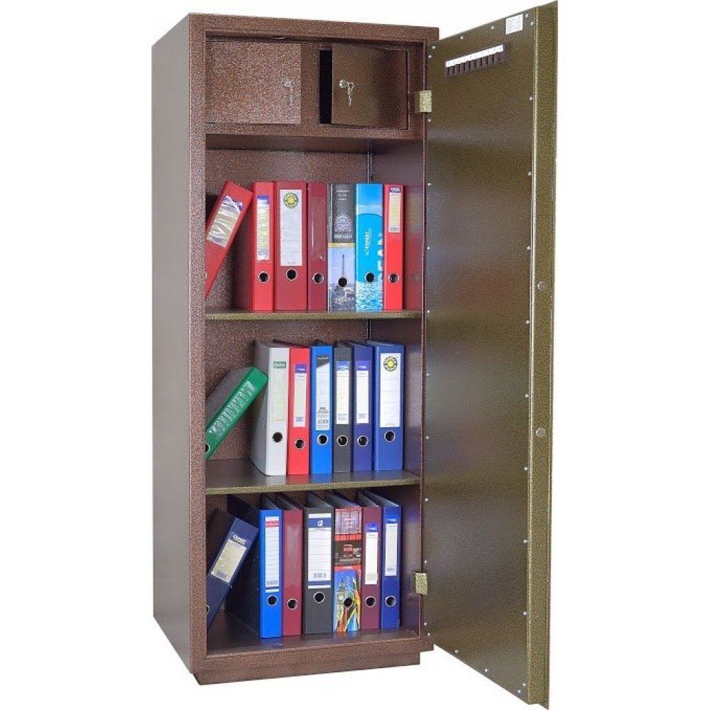 Сейф двухсекционный, оснащен двумя съемными полками и Трейзером. В двери установлен ключевой 8-ми сувальдный замок ЗАО «Про-Сам» г. Рязань или аналогичный замок другого производителя.
