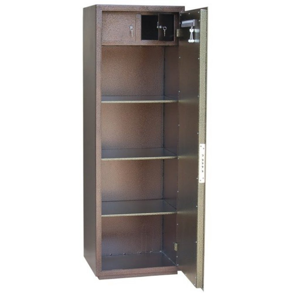 Сейф односекционный, оснащен тремя съемными полками и двумя Трейзерами. В двери установлен ключевой 8-ми сувальдный замок ЗАО «Про-Сам» г. Рязань или аналогичный замок другого производителя.