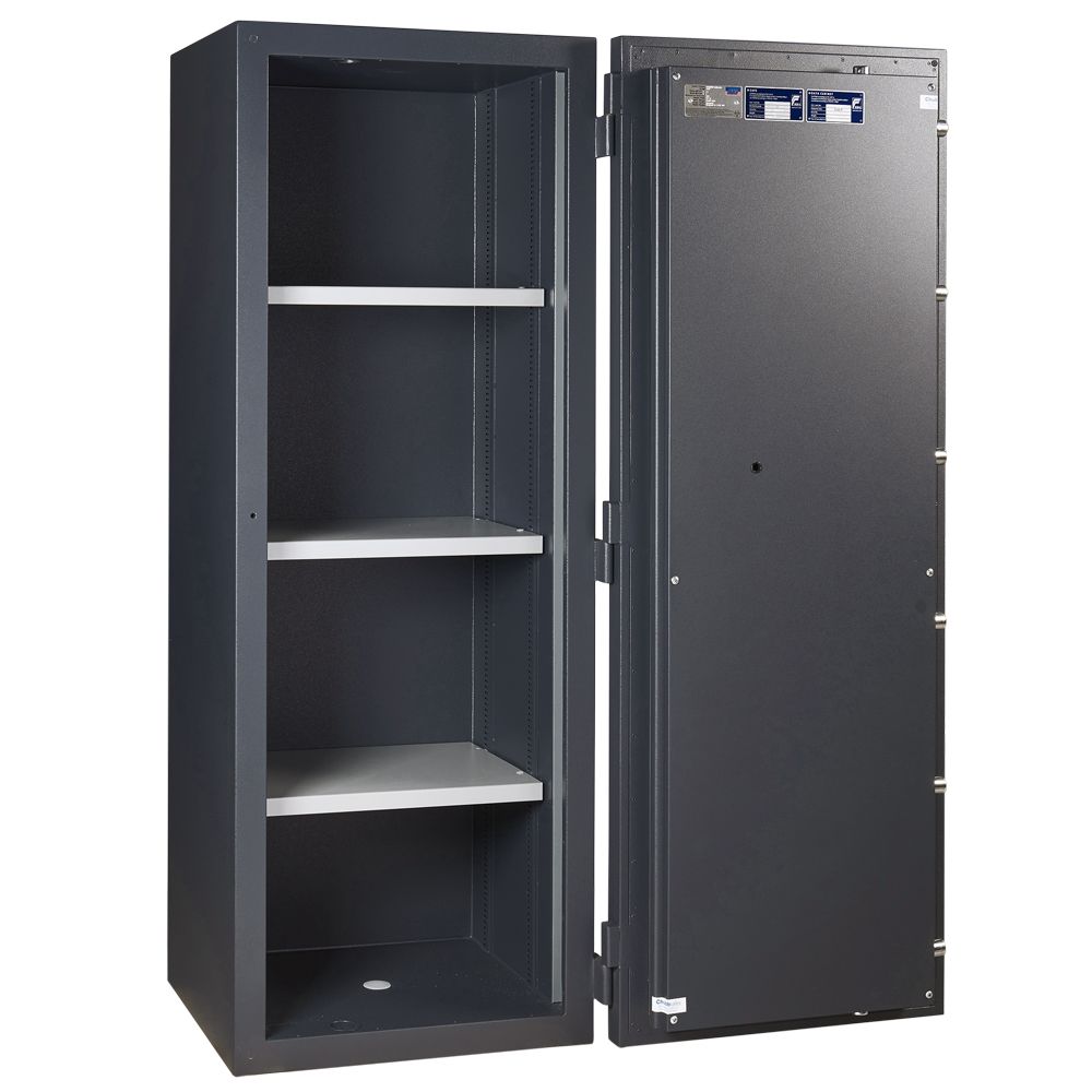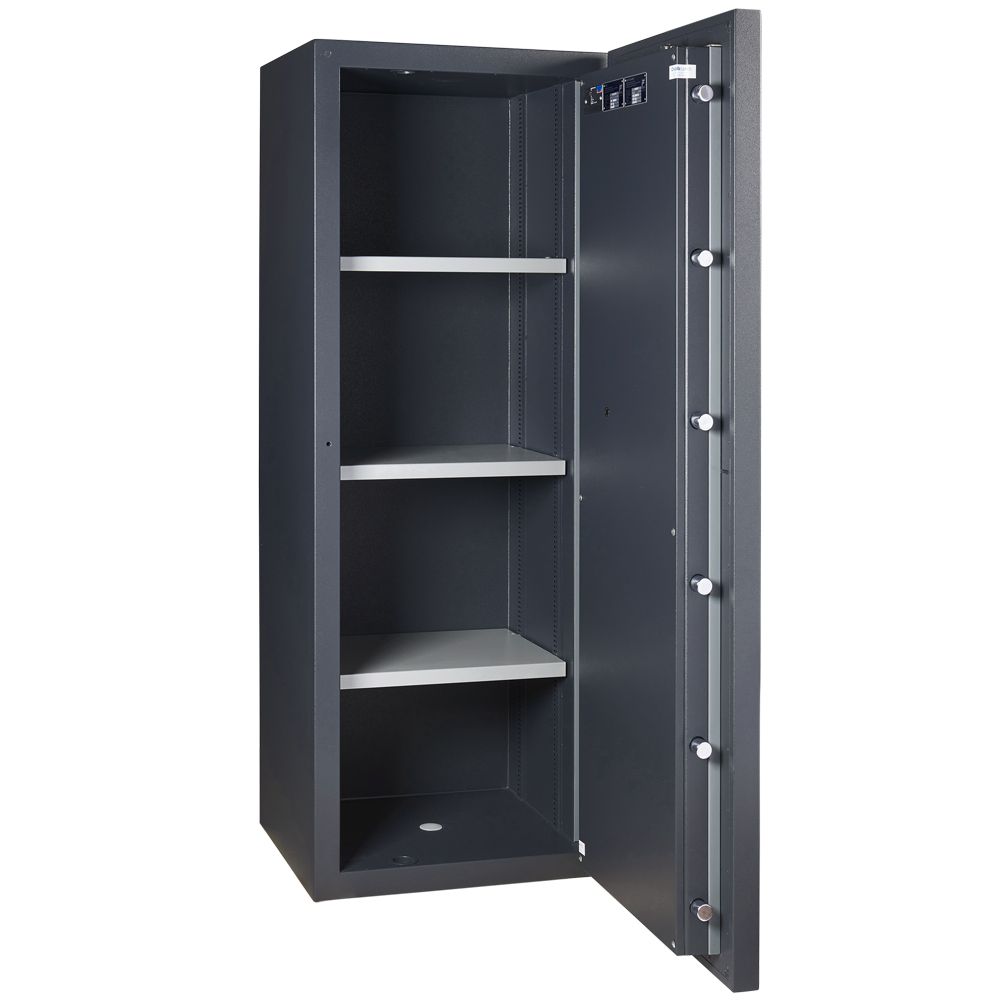 Вариант с комбинированными характеристиками защиты и внушительными габаритными размерами. Второй класс взломостойкости вкупе с устойчивостью к огню класса 60Р – не часто встречающиеся параметры у подобных сейфов. Благодаря прямоугольной вертикальной форме и полезному объему в 354 литра, данная модель подойдёт для любых категорий ценностей, включая предметы старины и коллекционирования с нестандартным форматом. Входящие в комплект три съёмные полочки можно легко переставлять по всей высоте сейфа и создавать отдельные зоны для разных ценных вещей. Оба класса защиты, а также замок проверены и подтверждены европейскими сертификатами ECBS. Метод крепления (фиксации) - к полу специальным болтом, входящим в крепёжный комплект. Этот металлический сейф обладает корпусом и дверцей из двухслойной стали, внутри которой находится специальный инновационный композит, не поддающийся силовым атакам и создающий барьер для экстремальных температур.
