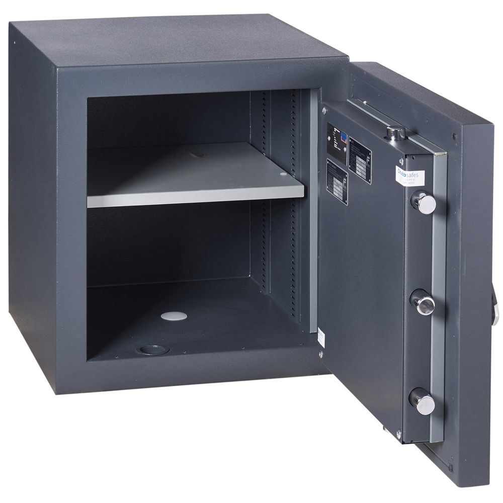 Модели из представленной габаритной линейки объёмом в 62 литра хорошо зарекомендовали себя, как офисные сейфы с двойной защитой – взлом + пожар. Взломостойкие, также как и огнестойкие качества подтверждены европейскими сертификатами: EN 1143-1 Eurograde 1 и EN 1047-1 S60P, испытанными по ECBS. Вышеуказанный класс огнестойкости обеспечивает защиту ценностей (включая бумажные), находящихся внутри сейфа, в течение 60 минут, при окружающей температуре открытого огня до 1000 градусов по Цельсию. Отличительными особенностями являются ригели диаметром 28 мм в количестве пяти штук; дверца с радиусом открытия в 180 градусов для удобства эксплуатации; внешние усиленные петли с защитой от демонтажа. Замок ключевой (сертифицирован EN 1300 Класс A) сувальдного типа, защищенный от высверливания и выпиливания. Сам ключ с двойной бородкой.