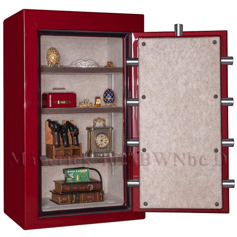 Дверь сейфа Maverick 4024BWNbc D оборудована высокосекретным кодовым электронным замком Sargent & Greenleaf (США), защита двери от взлома обеспечивается мощным поворотным реечно-зубчатым механизмом приводящим в действие 9 ригилей диаметром 38мм. и системой из блокираторов (релокеов), которые полностью блокируют дверь при попытке механического и термического воздействия.
