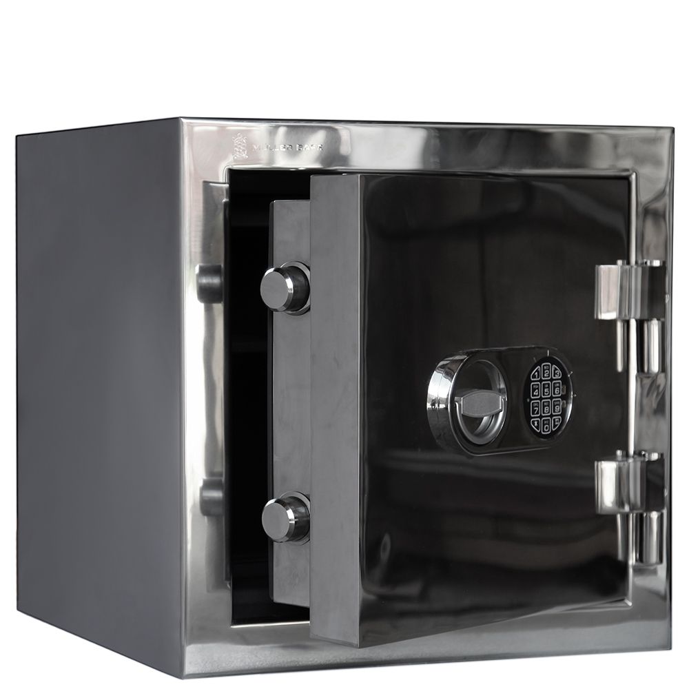 Немецкая компания Meuller Safe изготовила сейф по заказу компании "Мир Сейфов". St.Gallen Strong в формате 500х500х500 - это единственный экземпляр, который представлен в московском салоне компании. Сейф представляет собой маленькую копию большой модели St.Gallen Chrome. Корпус из нержавеющей стали отполирован до уникального для этого металла зеркального блеска, за счет этого он способен буквально раствориться в пространстве любого интерьера. Внутренняя отделка сейфа выполнена из натуральной кожи Navy blue parigi, в верхней части сейфа расположены ячейки для автоподзаводов Swiss Kubik, есть подсветка.