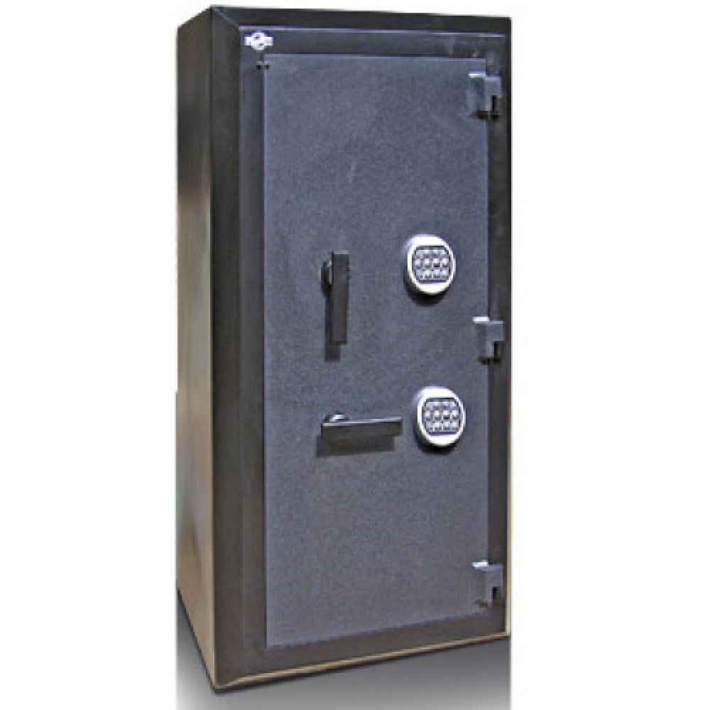 Электронный замок с вандальноустойчивой клавиатурой. Кроме того в замковой системе предусмотрен механизм блокировки ригелей при попытке взлома или удара. При попытке взлома все ригеля блокируются в закрытом положении. В базовой комплектации сейфы оборудованы ключевыми замками STUV (Германия), электронным или механическим кодовым M-Locks (Нидерланды).