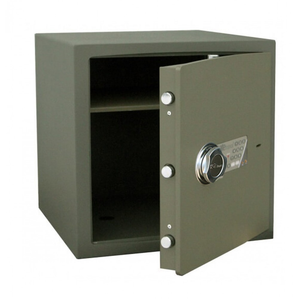 Толщина лицевой панели составляет 10мм. Корпус состоит из двух частей: внешний корпус изготавливается из металлического листа толщиной 3мм, внутренний - из металлического листа толщиной 2мм, между которыми находится несколько слоев наполнителя (SMREKOLIT), толщиной 20мм. Благодаря этому, данная серия сейфов соответствуют 1 классу защиты от взлома и обеспечивают начальную защиту от пожара. Взломостойкие сейфы серии NTR EM электронным замком и с дополнительным (зависимым) ключевым замком (не аварийным). Система запирания этих сейфов аналогична моделям типа MLG т.е сначала набираем код, потом поворачиваем ключ. Область замка сейфов защищена двумя пластинами из марганцовистой стали, защищающими замок сейфа от высверливания. Сейфы серии NTR сертифицированы по европейскому стандарту EuroVDS (Германия), чешскому CSN-9160010 и российскому ГОСТ Р-50862-96 - 1 классу защиты от взлома. Глубина сейфа указана без учета ручки.