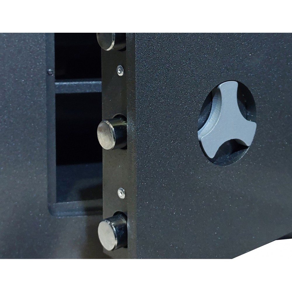 Толщина двери составляет 12мм. Задняя и боковые стены состоят из одного слоя стали толщиной 3мм, и, благодаря этому, данная серия сейфов соответствуют 1 классу защиты от взлома. Взломостойкие сейфы серии STR Е оснащаются электронными замками SAFEtronics (Словакия) с выводом под питание. Предусмотрена трехсторонняя ригельная система запирания. Область замка сейфов защищена двумя пластинами из марганцовистой стали, защищающими замок сейфа от высверливания. Сейфы серии STR сертифицированы по европейскому стандарту EuroVDS (Германия), чешскому CSN-9160010 и российскому ГОСТ Р-50862-96 - 1 классу защиты от взлома.