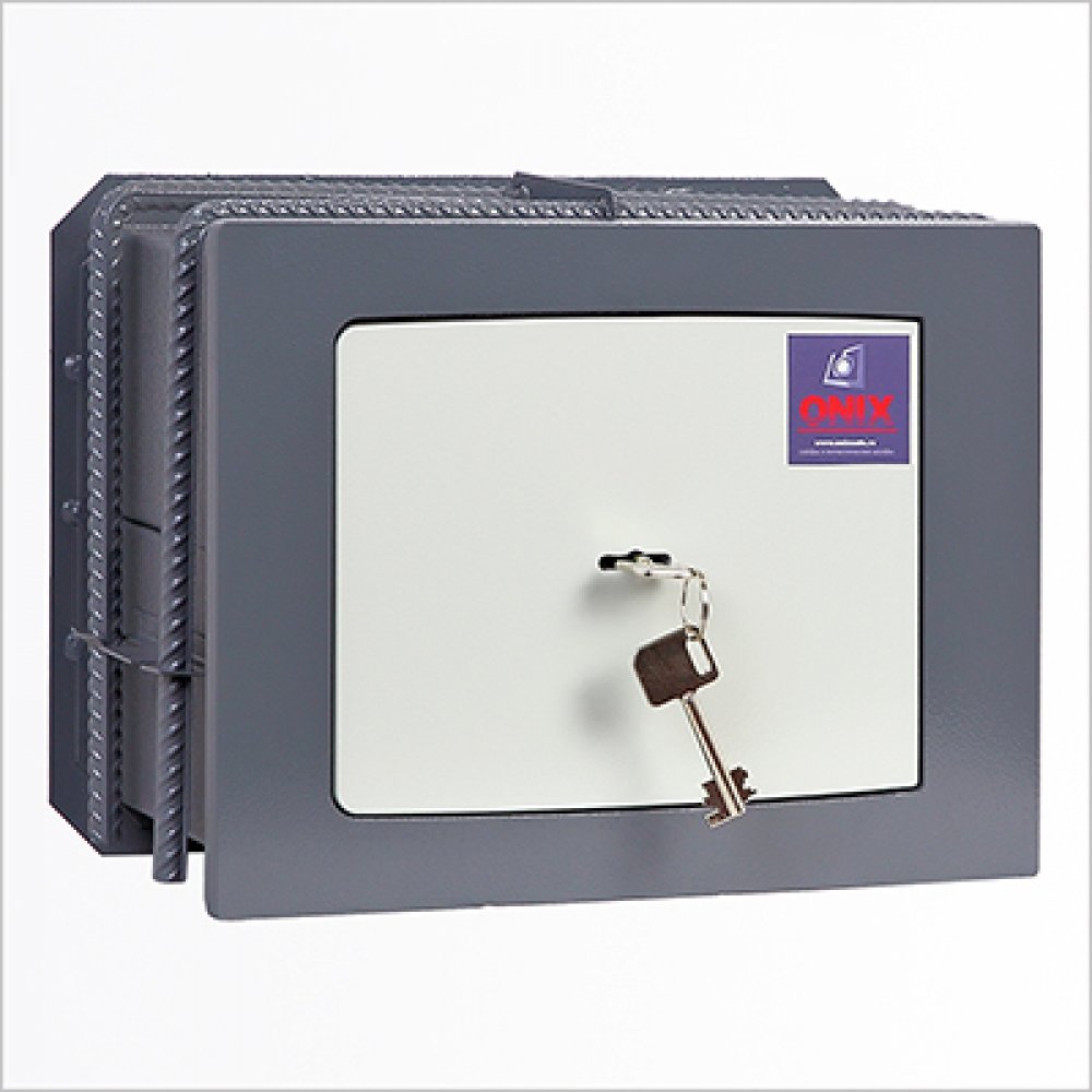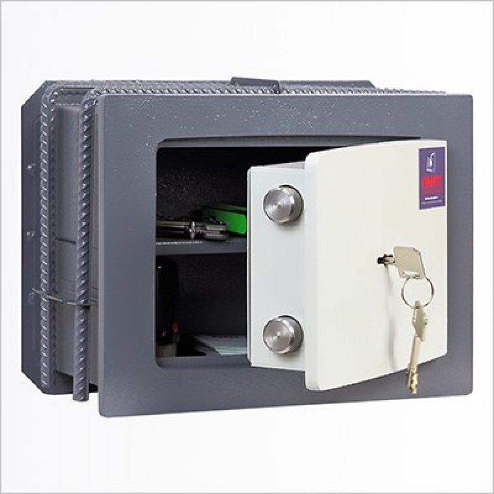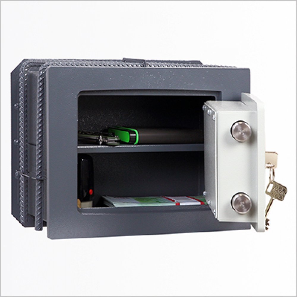 Встраиваемый сейф для дома с ключевым сувальдным замком. Сейф устанавливается в заранее подготовленной нише и крепится специальной арматурой, обеспечивающей его сохранность. Внутри сейфа находится съемная полка. В дверь установлен ключевой сувальдный замок с 2 ригелями.