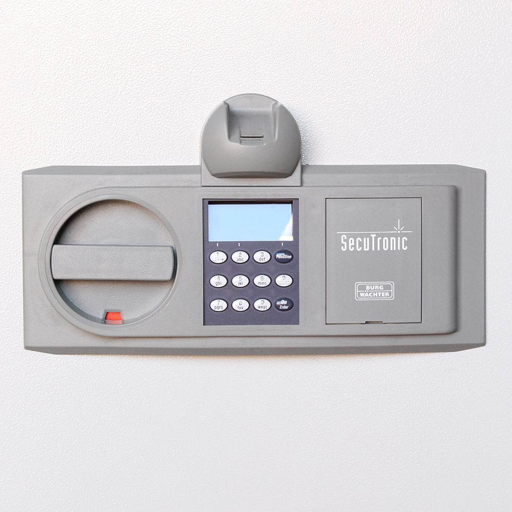 Корпус сейфа сварной, изготовлен из стальных листов и имеет конструкцию для монтирования в специальную нишу в стене. Лицевая панель двери изготовлена из стали толщиной 10 мм. На дверь встраиваемого сейфа Burg-Wachter установлен электронный кодовый замок со встроенным модулем сканирования отпечатков пальцев, замок защищен от высверливания специальной твердосплавной пластиной.