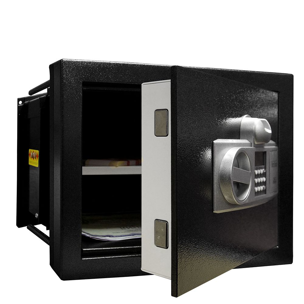 Корпус сейфа сварной, изготовлен из стальных листов и имеет специальную раздвижную конструкцию которая позволяет регулировать глубину для монтирования в нишу стены. Лицевая панель двери изготовлена из стали толщиной 7 мм. На дверь встраиваемого сейфа Burg-Wachter установлен электронный кодовый замок со встроенным модулем сканирования отпечатков пальцев, замок защищен от высверливания специальной твердосплавной пластиной.