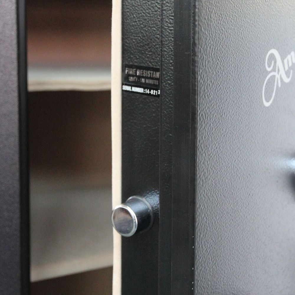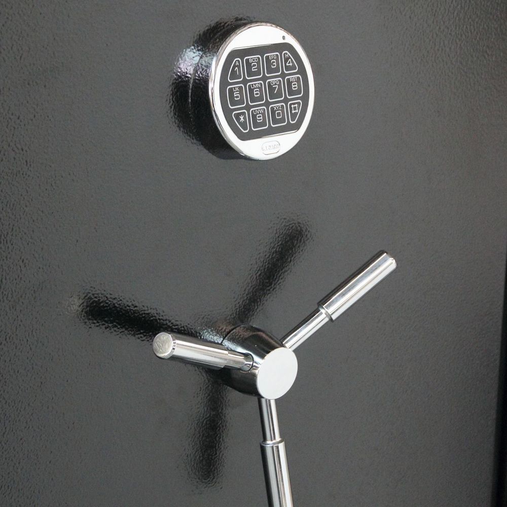 Дверь сейфа American Security YF 6032-ES оборудована высокосекретным кодовым электронным замком, защита замка обеспечивается трёхслойной закалённой пластиной, оборудована мощной многосторонней ригельной запирающей системой, тип запирающего механизма двери - эксцентриковый.