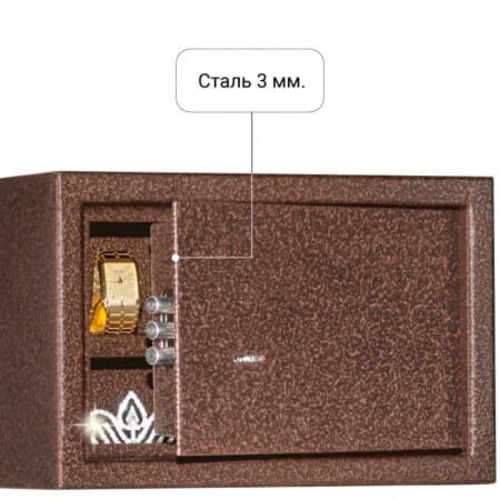 Усиленный корпус. Дверь сейфа усиленная коробчатая. Передний лист двери - сталь 3 мм. Петли - внутренние.