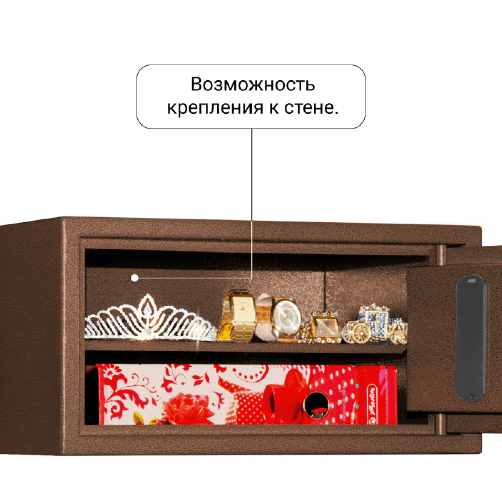 Предусмотрена возможность установки сейфа в мебель, крепления сейфа к стене, к полу, мебельной полке и т.п.