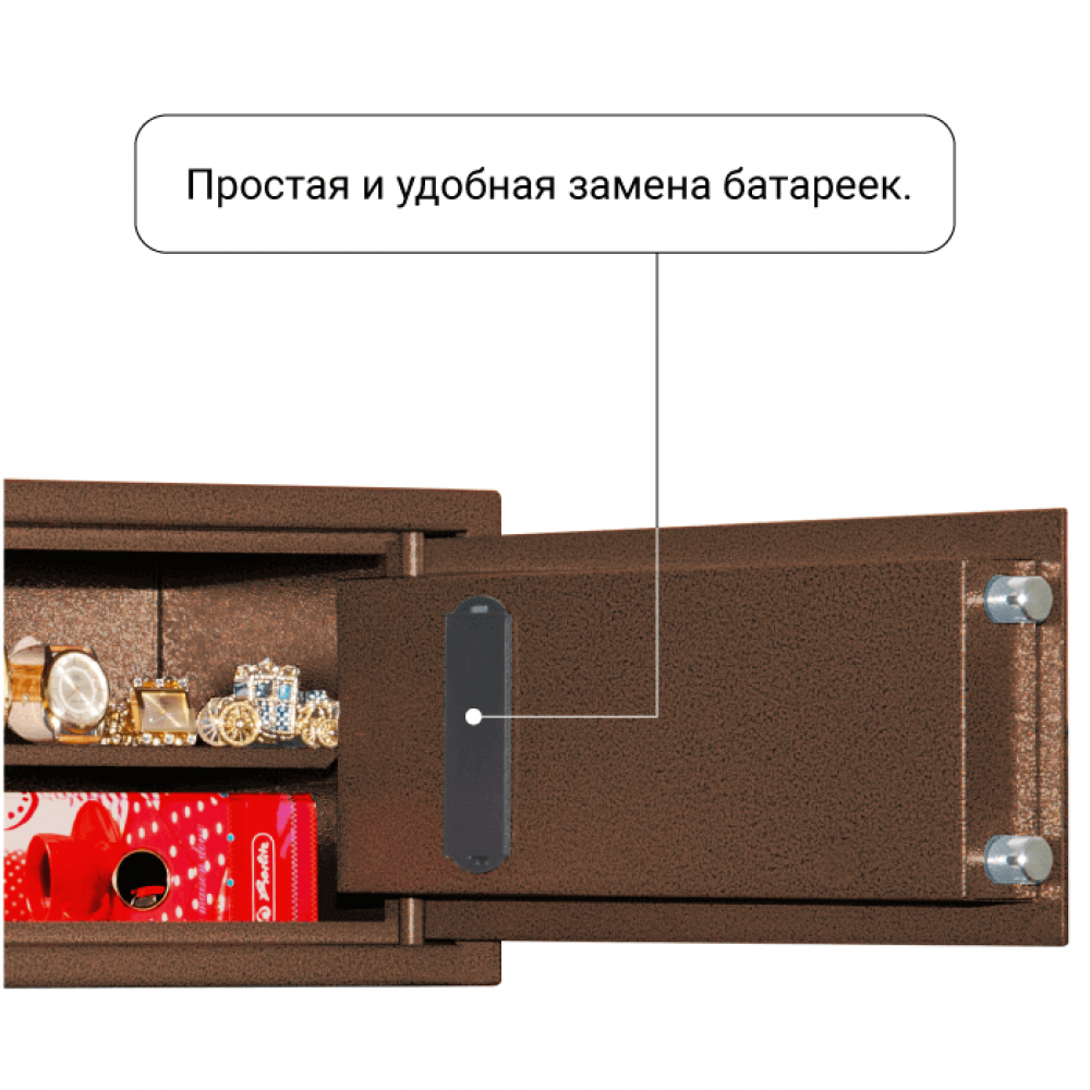 Внутри сейфа съёмная полка. Дно сейфа отделано ковролином.