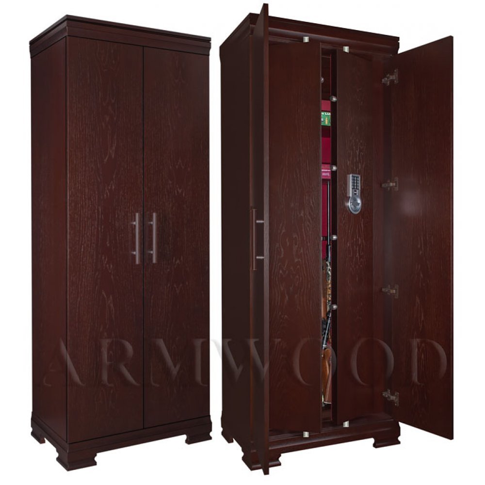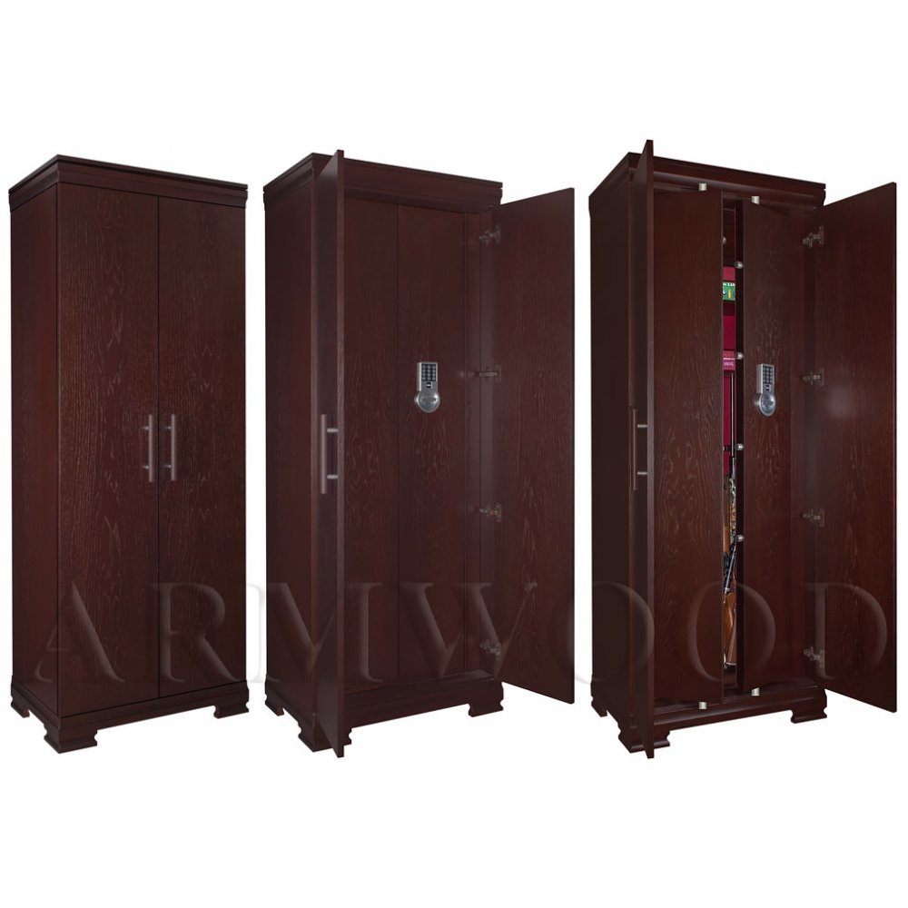 Сейф в скрытом исполнении. Имеет две дополнительные наружные мебельные двери, за которыми скрыт непосредственно сам сейф. Снаружи изделие выглядит как деревянный мебельный шкаф. Сейфы полностью удовлетворяют требованиям МВД к хранению оружия. Наружная отделка - натуральное дерево (под различную мебель). Универсальный сейф, может использоваться как оружейный сейф либо как личный (офисный) сейф.