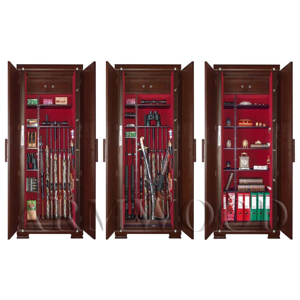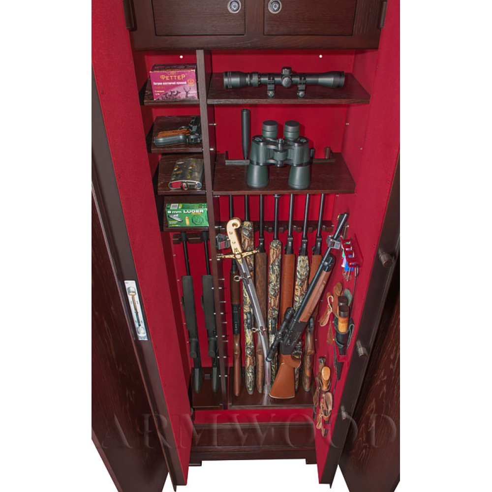 Внутри «широкой» области 5 съёмных полок и деревянные ложементы на семь стволов. Также в «широкой» области имеются два боковых роликовых зажима с регулируемой высотой установки (для хранения в широкой области восьмого и девятого ствола либо для дополнительной фиксации оружия с оптикой).