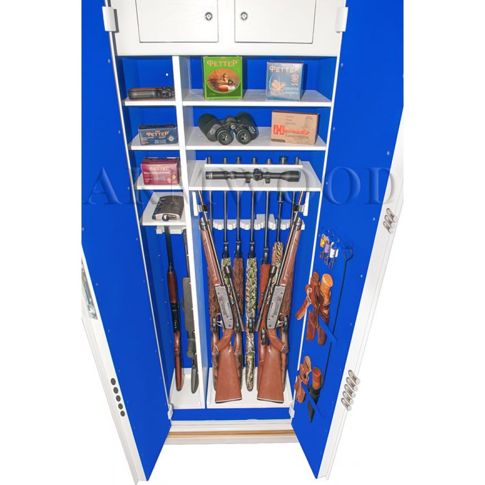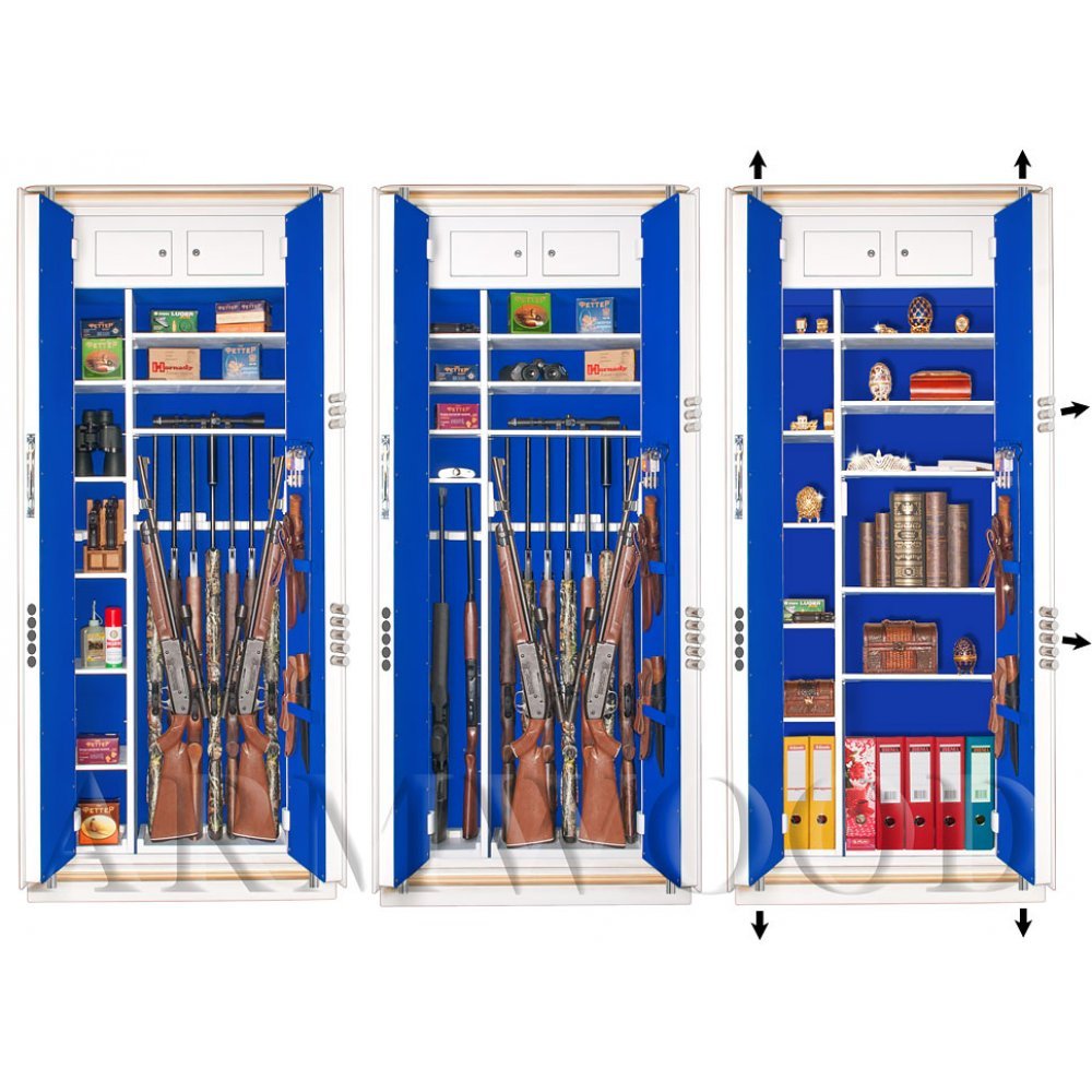 Внутри «широкой» области 5 съёмных полок и деревянные ложементы на семь стволов. Также в «широкой» области имеются два боковых роликовых зажима с регулируемой высотой установки (для хранения в широкой области восьмого и девятого ствола либо для дополнительной фиксации оружия с оптикой).