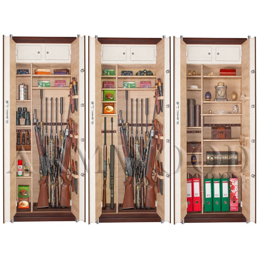 Внутри «широкой» области 5 съёмных полок и деревянные ложементы на семь стволов. Также в «широкой» области имеются два съёмных боковых роликовых зажима с регулируемой высотой установки (для хранения в широкой области восьмого и девятого ствола либо для дополнительной фиксации оружия с оптикой).