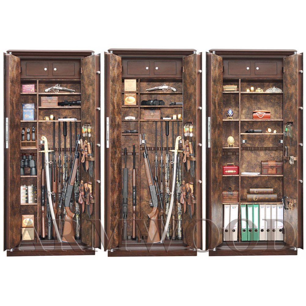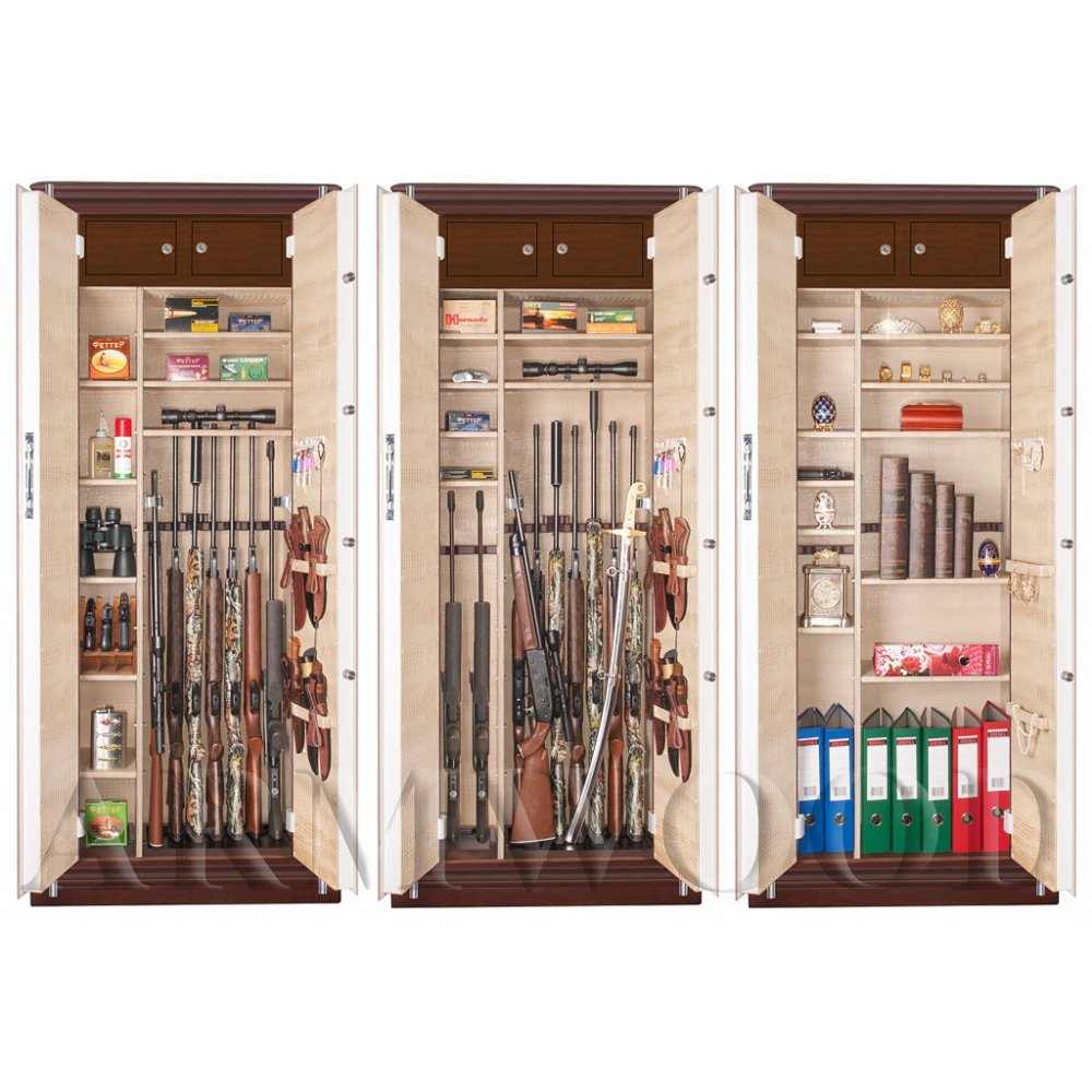 Внутри «широкой» области 5 съёмных полок и деревянные ложементы на семь стволов. Также в «широкой» области имеются два боковых роликовых зажима с регулируемой высотой установки (для хранения в широкой области восьмого и девятого ствола либо для дополнительной фиксации оружия с оптикой).