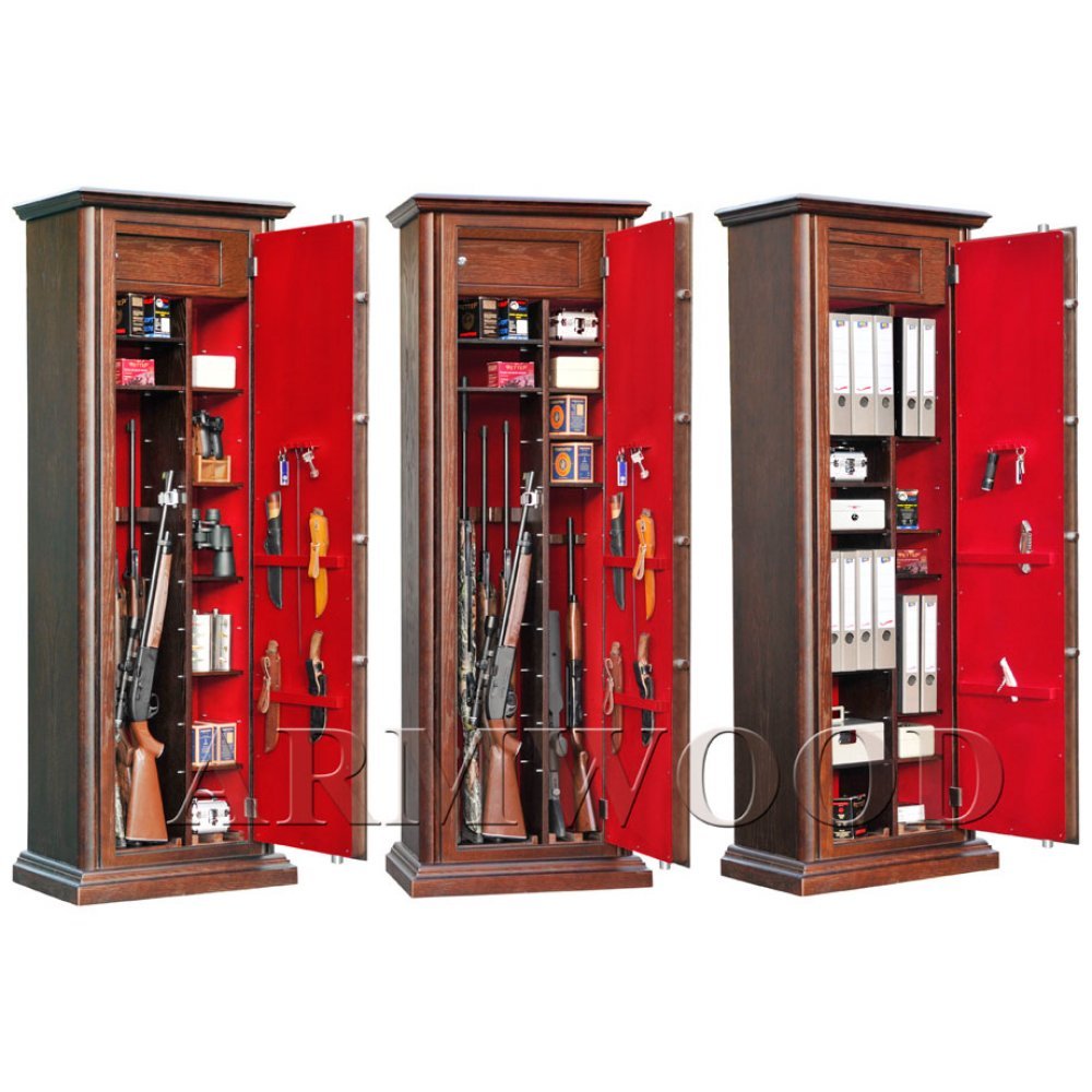 Внутри сейфа есть запираемое (патронное) отделение и вертикальная перегородка, которая делит внутреннее пространство сейфа на две половины. Внутри одной половины есть пять съёмных полок и съёмные деревянные ложементы на четыре ствола. Также там имеется съёмный боковой роликовый ложемент-зажим (производства Германии) с регулируемой высотой установки (для хранения 5-го ствола, либо для дополнительной фиксации оружия с оптикой). Внутри второй половины есть пять коротких съёмных полок и съёмные деревянные ложементы на два ствола.